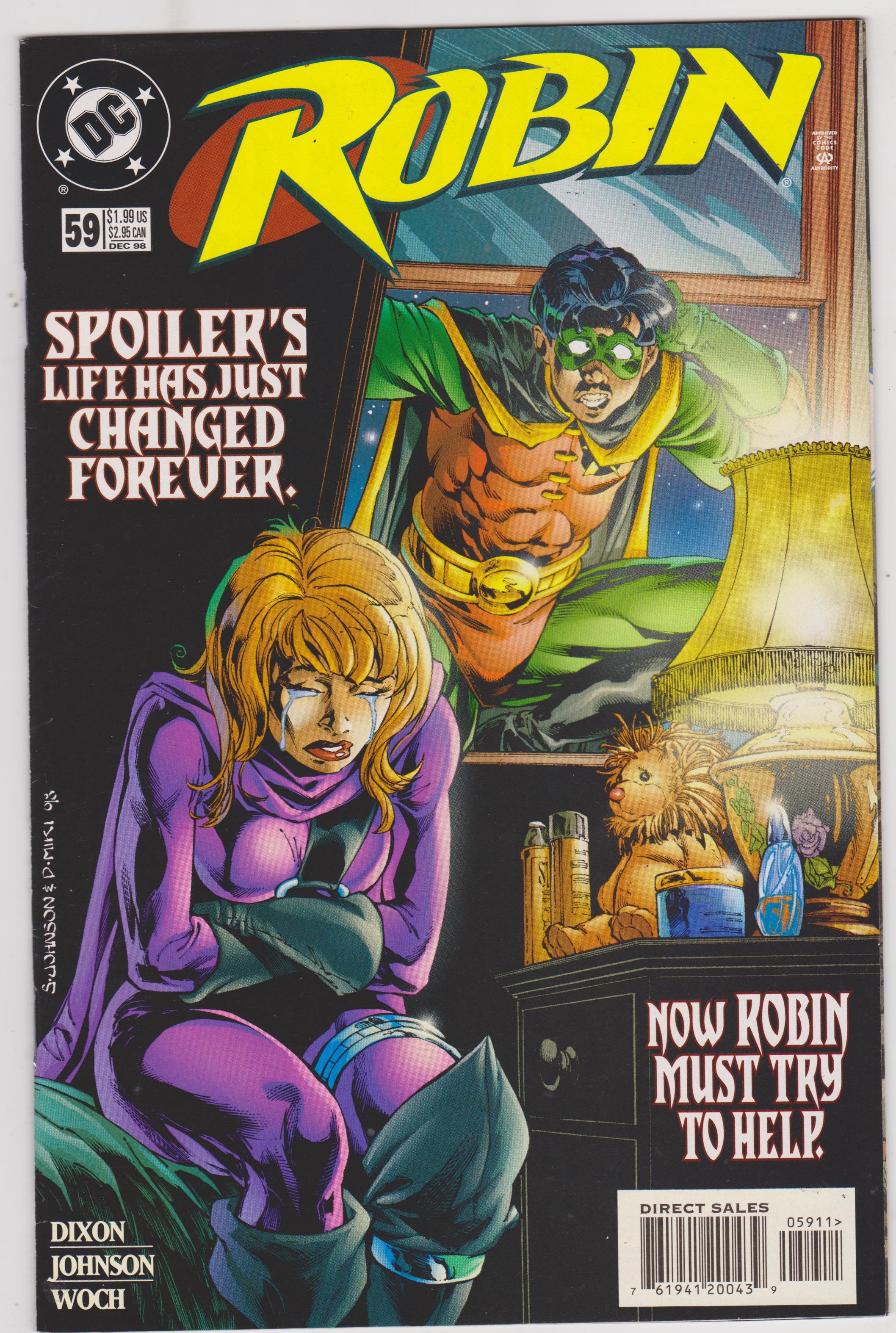 Robin #59 by DC Comics copyright 1998. I have graded the comic book, using the Overstreet Grading Guide, at FINE/VERY FINE with the following defects: Light stress marks along the spine. The corners are rounded. There is light yellowing of the pages.Follow me on titter @denofwonder for updates.