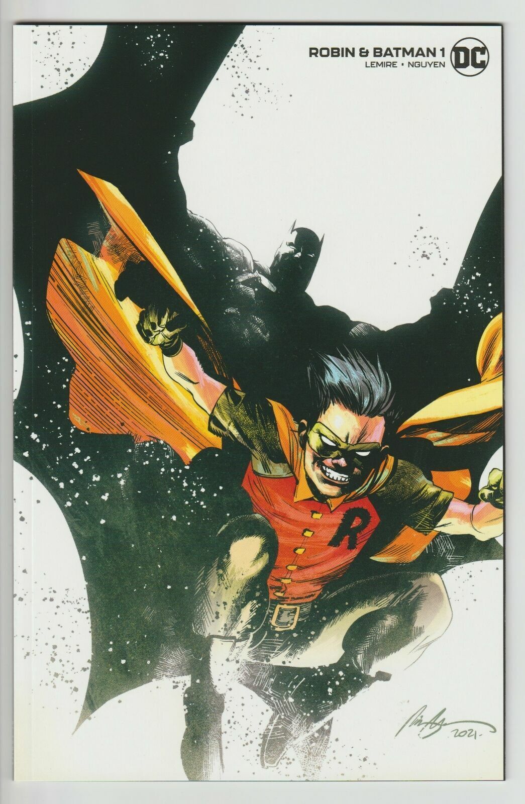 Grade: 9.2 Near Mint-Item Information: ROBIN & BATMAN #1 1:25 ALBUQUERQUE VARIANT DC COMICS 2021 EB188DC COMICS(W) Jeff Lemire (A) Dustin NguyenThe legendary story of Batman and Robin has reached nearly mythic proportions: the crime-fighting Dynamic Duo, always one step ahead of the criminals they pursue and never meeting a case too big. This isn't that story. This is the story of a young Dick Grayson, newly orphaned, struggling to find his way in a strange, difficult, dark new world...This is the story of Robin and Batman. The bestselling creative team behind the Eisner-winning Descender, Jeff Lemire and Dustin Nguyen, reunite in Gotham City to tell the story of a remarkable young man learning to navigate an incredible new world!*Please note we put a generic grade of 9.2 VF/NM on all of our listings of comics but most are in better condition with very few being worse.*Terms: We are happy to combine shipping on domestic shipments. If you purchase more than one item, and the following rate does not properly apply, please request a combined shipping invoice before making payment:First book is $4.99, each additional book adds $1.00 We DO NOT ship media mail for comics, because those shipments are legally not supposed to contain advertising and are subject to inspection. Media mail shipments also take longer to arrive, so with our First Class or Priority Mail shipment you will get your books in a timely manner and you can trust our integrity in following legal guidelines. We also take special care to package items securely, unlike others who are more concerned with expediency (and skirting shipping rules).If you are and international bidder:We use Hip's international shipping program. Information about this program and to see if you country qualifies check here: