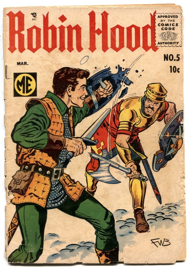 Grade: G+Robin Hood #5 1956- ME comic book- Sir Gallant G+ -Frank W. Bolle art. -Sir Gallant vs The Red Knight. -Pieces out of spine and edges of covers. -Complete. Grade: G+ SKU: DO-15-377