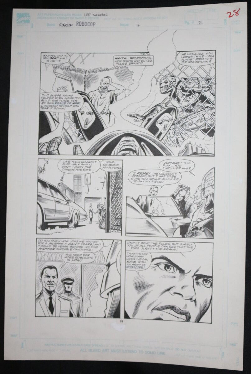 RoboCop #14 p.21 / 28 - LA - RoboCop defeats Colonel Flak - 1991 art by Lee Sullivan and Harry CandelarioSize: 13.5 x 20.5This item was uploaded by Bobby.If you have any specific questions or requests, please ask us prior to ordering and we'll get back to you as soon as we can. If there are any problems with your order whatsoever, please message us before leaving feedback and we'll be happy to work with you to fix the situation!We ship worldwide, combine purchases, and charge exact shipping. The price may vary based on size, weight, and location. If you are automatically overcharged for shipping, message us and we'll be happy to revise the invoice or refund you the excess amount. If you have any questions regarding shipping, please message us.International Buyers - Please Note: Import duties, taxes, and charges are not included in the item price or shipping cost. These charges are the buyer's responsibility. Please check with your country's customs office to determine what these additional costs will be prior to bidding or buying. Payment can be made by PayPal and credit cards directly. 120,000+ items in total in my Hip store! Frequently Asked Questions: When are your operation hours?Our in office hours are Monday - Friday, 11 am - 8 pm. We are not open on weekends, so if you send us a request on Friday evening we won't get back to you until Monday afternoon. Please don't take it as us ignoring you! We will work on your request Monday and get back to you as soon as we can. Also, if you order from us on a Friday evening or Saturday morning we won't start processing your order until we open on Monday. That means on Monday it will be pulled and prepped for shipping, then picked up by the postman on Tuesday morning.When will you ship my item? The tracking hasn't moved.We realize you're eager to get your item, so if the tracking hasn't moved in a few days please don't be concerned. We give the postman a lot of packages daily, sometimes as many as 100, so he does not scan each item for us upon pickup as he says it would be too time consuming for him to do so. If you get a tracking number from us, that almost always means your item was picked up by the postman the next business day. The USPS is also imperfect. There are times when the tracking won't even show movement until it's in your area's regional distribution center. This is normal in our experience. Is this original artwork? Yes! I am a professional comic book art dealer with 20+ years experience. The image pictured is one of a kind original artwork unless otherwise described. Can you issue a COA? We can, upon request. Please make sure you leave us a note while checking out and shoot us a message immediately after requesting one, just to be sure. What is your base shipping for art? $10 for Domestic, International varies depending on location. Please use Hip's shipping calculator for specifics. How do you ship comics?We ship in rigid cardboard mailers to protect your comic book from the worst the mail system has to offer. Price varies based on the number of books you purchase, but we try to keep costs as low as we can and charge exact shipping. If it looks unusually high to you please send us a message and we'll be happy to double check for you. What is your base shipping for CGC comics? Domestic for CGCs are $10 for the first and $5 for each additional one you add. Do you combine shipping? Yes, of like items. Such as: several comics can fit in one cardboard mailer, as can more than one record. Multiple art pages can easily be combined because they are light and thin. Where combined shipping differs is with size and weight. For instance, two statues require a much bigger box. Same goes for CGCs, as the package gets bigger and heavier as you go. Do you ship well? I've had some bad experiences... You needn't worry; we are professionals who value your business and want your item to arrive safely as much as you do. I have been collecting for over 30 years. I send out items the way I would like to receive them. The tracking says my item is "OUT FOR DELIVERY" in New Jersey. Why is that?If the tracking indicates that the item is "OUT FOR DELIVERY" in NJ don't worry, it's just what the tracking says when it's carried over from the postman to the sorting center. This is normal for our Post Office and will not impact you receiving your item in a timely matter.Have these CGCs had any previous owners? No. I have personally sent in almost all of these to CGC and had them returned to me, offering them fresh to the market for the 1st time. I changed my mind after successfully winning the auction or fixed price listing, will you cancel the transaction? Please only bid or hit BUY IT NOW if you are willing to follow through and pay for the item, we will not cancel the transaction. As a seller, Hip penalizes us every time we cancel an order, so it is detrimental to our business to do so. Therefore if you will not pay, then you'll have to let Hip cycle this to an "unpaid item" and accept whatever action Hip deems necessary. 120,000+ items in total in my Hip store! MEET OUR STAFF: Pictured left to right, my employees: Bobby, Justin, Mario V., Connelly, Mario B., Alejandro, Sumie, and Anthony.AS SEEN ON TV : I have been buying and selling artwork and comics for about 20 years. If you are new to buying art or comics feel free to ask any questions that you may have. 120,000+ items in total in my Hip store! Small, Regular, and Large Portfolios available; see my Hip store!