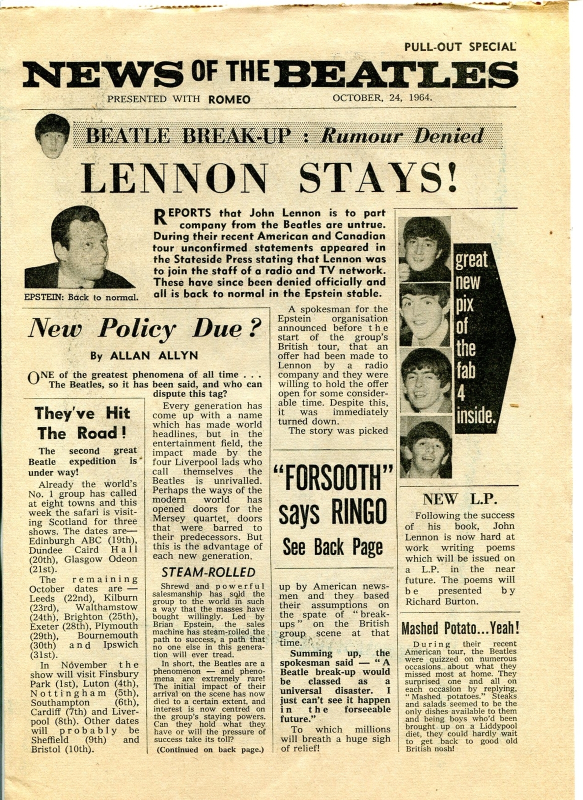Grade: FNRomeo 1964-british-tabloid romance comic-beatles-rock stars-fn -british tabloid format romance comic book with rock star pix -early beatles photos and info in a special pull out section -size is about 8 1/2 x 11 1/2 -rare item for the serious beatles historian or collector grade: fn sku: ctr-42-028