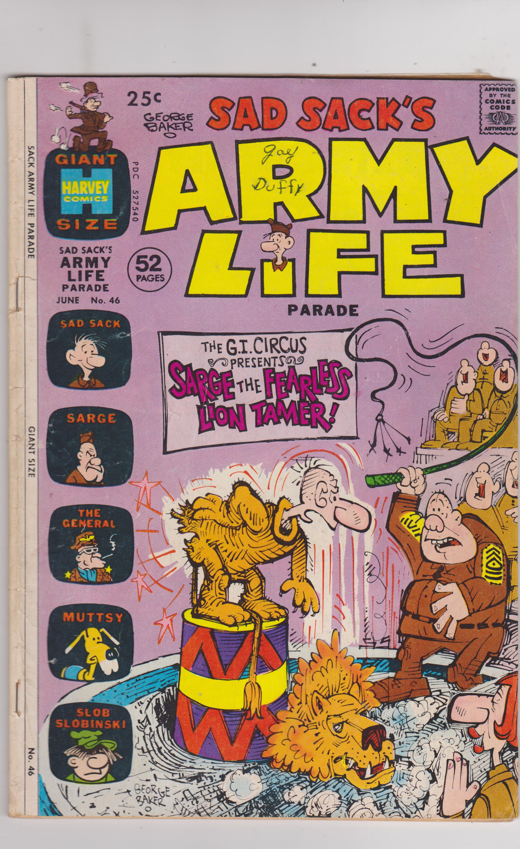 Sad Sack's Army Life Parade #46 by Harvey Comics copyright 1973. I have graded the comic book, using the Overstreet Grading Guide, at GOOD with the following defects: Light stress marks along the spine. Spine is rolled. The corners are rounded. Ink mark in the title. There is yellowing of the pages.Follow me on twitter @denofwonder for updates