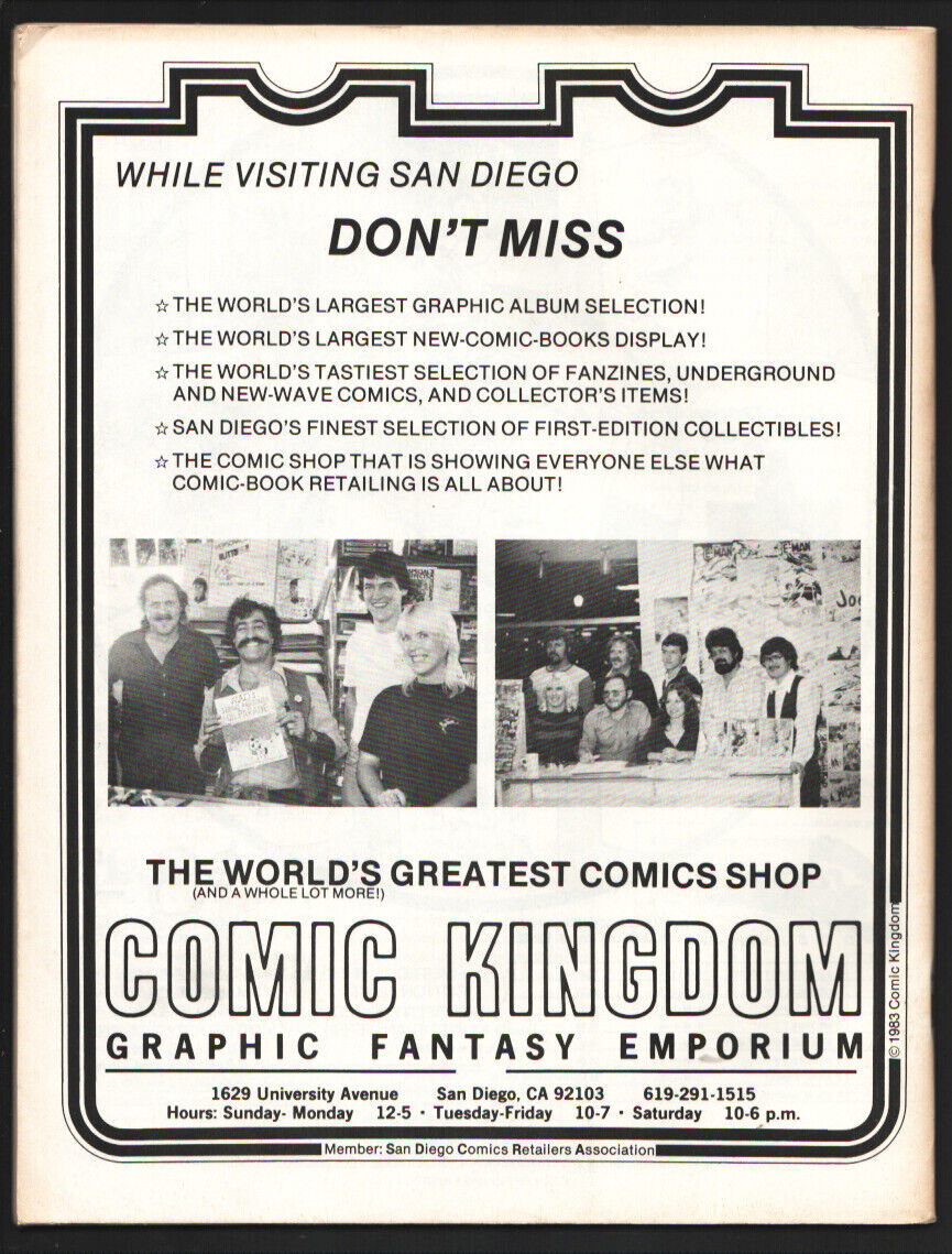San Diego Comic Conventuion Program Book Issue: / Year: 1983 Condition: FN-Rick Geary cover -Art by Harvey Kurtzman-Jack Kirby-Mike Royer-Joe Kubert-Moscaso-Dennis Ellefson-Trina Robbins-Phil Yoh-Willie Itpo-George Perez-Norman Maver-Milt Caniff-Alex Toth-Dave Stevens, and many more -Photos and Con info -Historic program book Publisher: SDCCSku: U15-79-096 Over 100,000 mail orders processed! Buy with confidence.