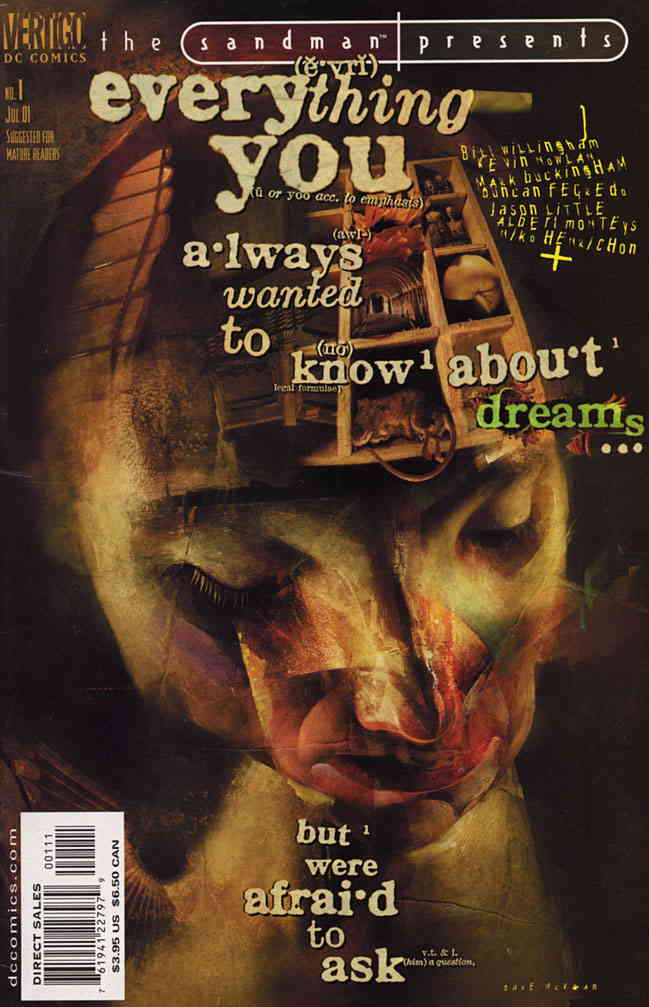 Item: Sandman Presents, The: Everything You Always Wanted to Know About Dreams But Were Afraid To Ask #1 | Publisher: DC/Vertigo | Cover Date: July 2001 | Writer: Bill Willingham | Artist: Albert Monteys, Duncan Fegredo, Kevin Nowlan, Jason Little, Mark Buckingham, Niko Henrichon | Cover Artist: Dave McKean | Storylines: What Causes Nightmares?; Do Dreams Sleep and Have Other Dreams of Their Own?; Why are so Many Dreams Sexual in Nature?; Why do Some People Dream in Color and Others in Black & White?; What Causes Recurring Dreams?; Are There Really Universal Symbols Which Occur in Dreams and Can They be Interpreted by Experts?; Why Aren’t You Supposed to Wake a Sleepwalker?; Why is it Often So Hard to Remember Your Dreams? | With Economy shipping, each additional comic ships for just 50 cents more to customers in the USA. This listing contains a stock photo and information from ComicBase™ and © Human Computing. The stock photo is for reference only. If you would like to see a photo of the actual item, please message us prior to purchasing.Seller Information