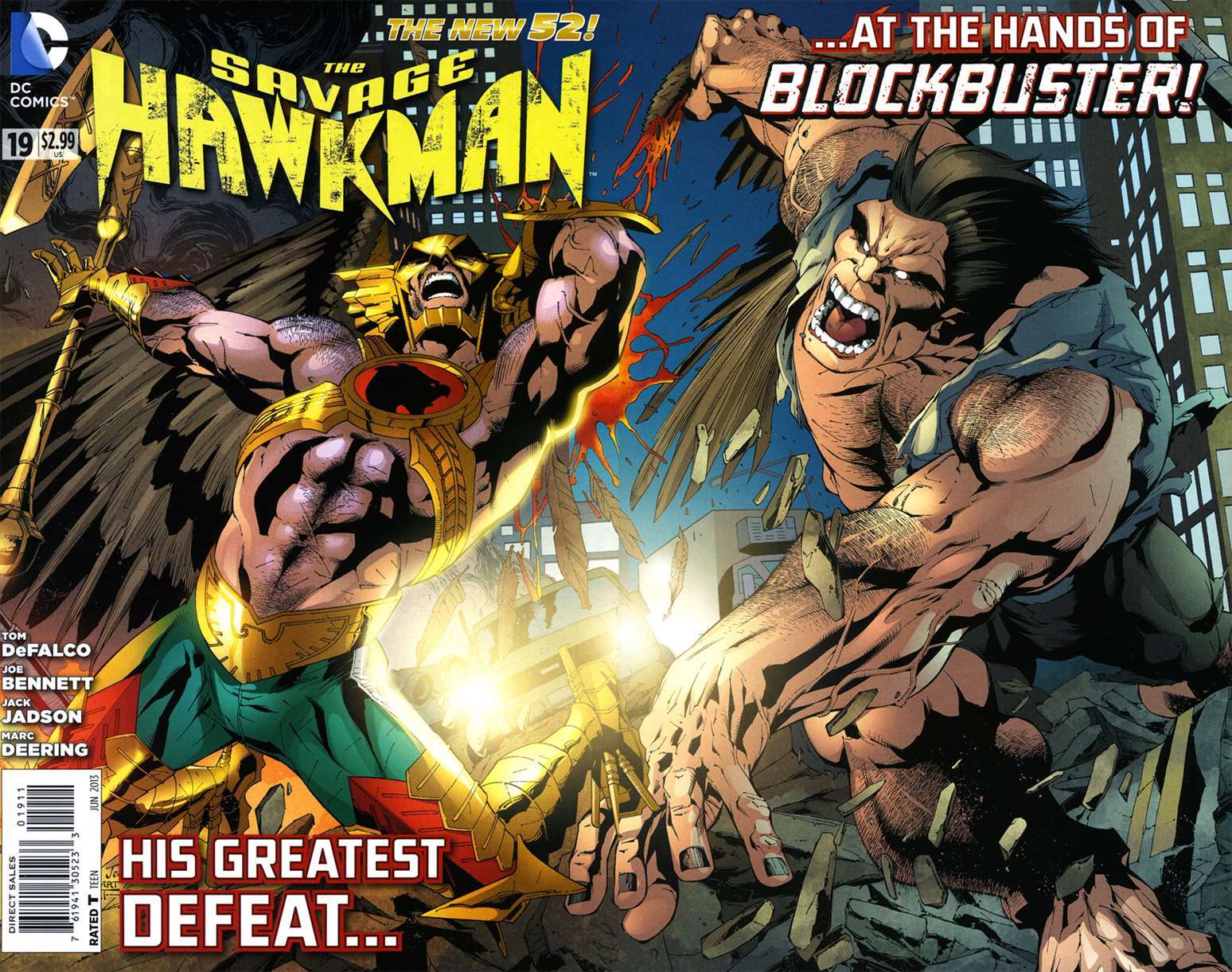 Item: Savage Hawkman, The #19 | Publisher: DC | Cover Date: June 2013 | Writer: Tom Defalco | Artist: Joe Bennett, Jack Jadson | Cover Artist: Joe Bennett | Appearances: Blockbuster | Storylines: Beware the Blockbus ... Read More