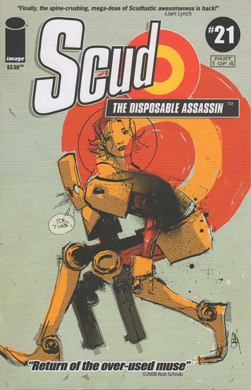 Item: Scud: The Disposable Assassin #21 | Publisher: Image | Cover Date: February 2008 | Writer: Rob Schrab | Artist: Rob Schrab, David Hartman | Cover Artist: Ashley Wood | Storylines: Return of the Over-Used Muse ... Read More