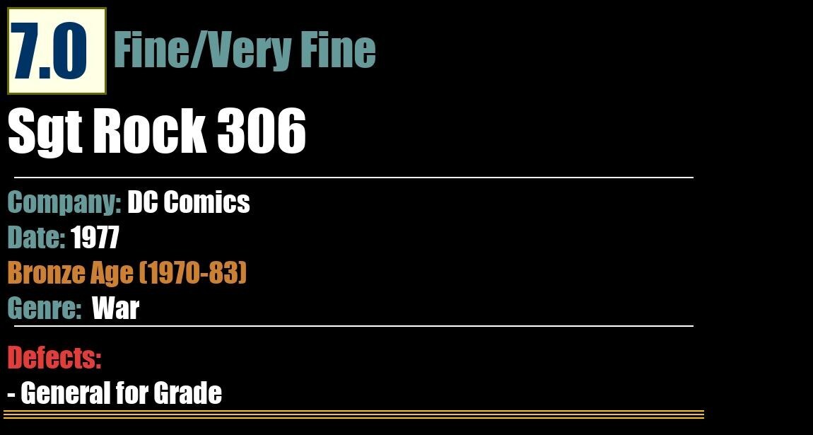 Grade: 7.0 Fine/Very Fine Shipping may take up to 5 business daysSgt Rock 306DC Comics - 1977WarBronze Age (1970-83)7.0 Fine/Very FineDefects:- General for Grade: