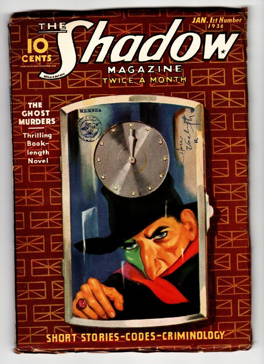 Shadow Issue: / Year: January 1 1936 Condition: FN-THE GHOST MURDERS -Unusual cover art -"Shadow Club" stamp on cover, name written in cover -Tiny chip missing top of spine -Off-white pages -Higher grade copy Publisher: Street and SmithSku: U15-99-016 Over 100,000 mail orders processed! Buy with confidence.