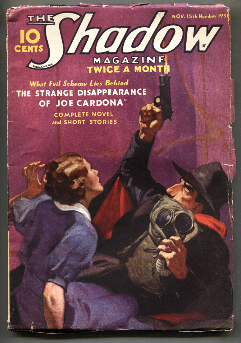 Grade: G+ SHADOW 1936 November 15 // STREET AND SMITH // RARE PULP MAGAZINE -STRANGE DISAPPEARANCE OF JOE CARDONA -Gas mask cover. -Pulp thrills Grade: G+ SKU: TN-30-012