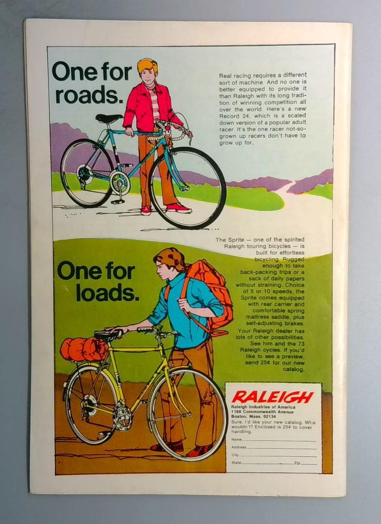 Inside this issue, advertisements include a notable Raleigh bicycles spread promoting their racing and touring models, reflecting the era's advertising landscape in DC Comics publications.