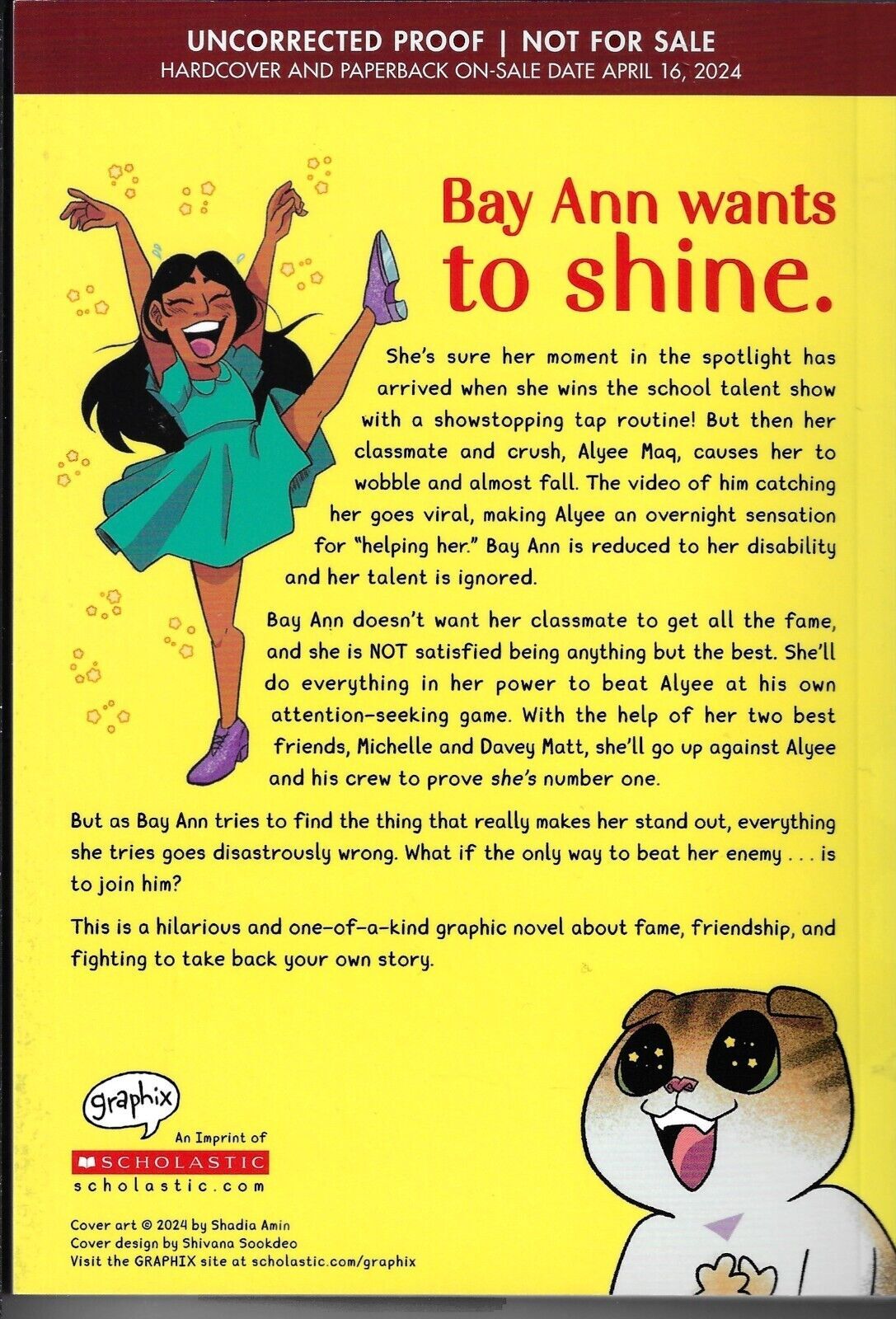 Grade: 9.2 Near Mint-Item Information: Shiny Misfits Uncorrected Proof Advance Copy Scholastic 2024 EB258She's sure her moment in the spotlight has arrived when she wins the school talent show with a showstopping tap routine! But then her classmate and crush, Alyee Maq, causes her to wobble and almost fall. The video of him catching her goes viral, making Alyee an overnight sensation for "helping her." Bay Ann is reduced to her disability and her talent is ignored.Bay Ann doesn't want her classmate to get all the fame, and she is NOT satisfied being anything but the best. She'll do everything in her power to beat Alyee at his own attention-seeking game. With the help of her two best friends,...*Please note we put a generic grade of 9.2 VF/NM on all of our listings of comics but most are in better condition with very few being worse.**We use the Stock Photo provided by the publisher, due to listing the items before release date. A few times the publisher will make small changes to the image before shipping them, including but not limited to adding trade dress, changing colors of the title, etc. We try and replace the image but do not always see the change. Please be aware.*Terms: We are happy to combine shipping on domestic shipments. If you purchase more than one item, and the following rate does not properly apply, please request a combined shipping invoice before making payment:First book is $4.99, each additional book adds $1.00 We DO NOT ship media mail for comics, because those shipments are legally not supposed to contain advertising and are subject to inspection. Media mail shipments also take longer to arrive, so with our First Class or Priority Mail shipment you will get your books in a timely manner and you can trust our integrity in following legal guidelines. We also take special care to package items securely, unlike others who are more concerned with expediency (and skirting shipping rules).If you are and international bidder:We use Hip's international shipping program. Information about this program and to see if you country qualifies check here: