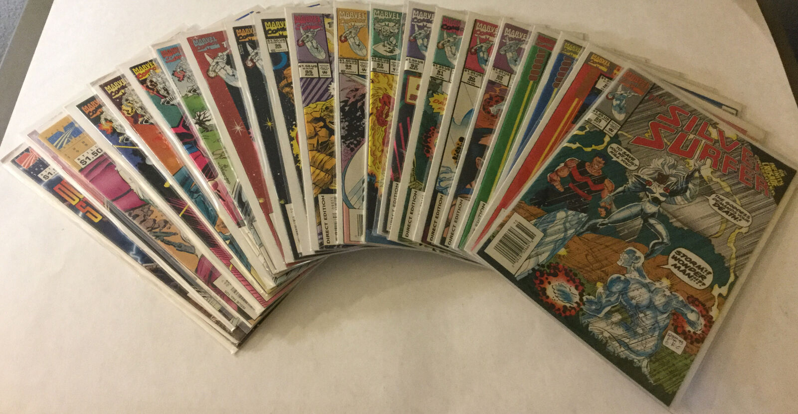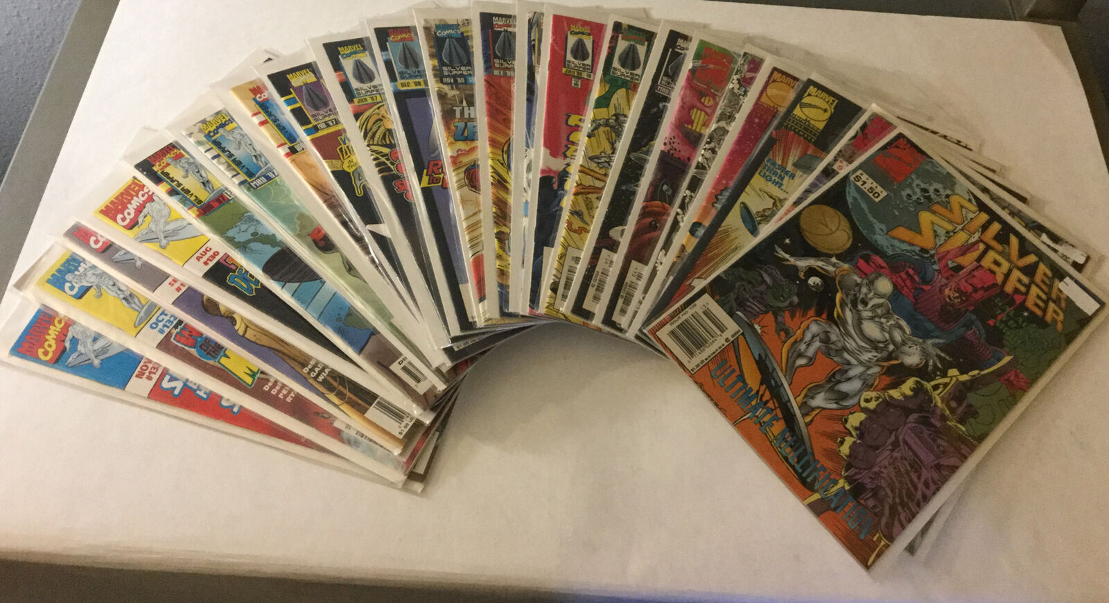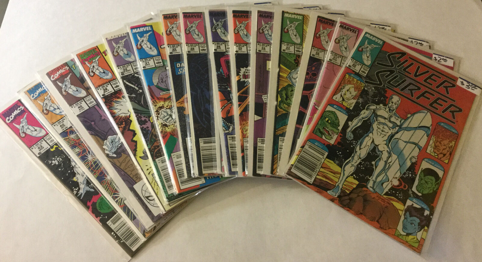 This lot includes Silver Surfer 1-6 9-18 20-29 31 32 39 40 42 43 45 46 48-63 65-97 99 101-113 115-118 120-124 126-141 143 Annual 1-7 Parable Flashback -1Here at Cloud 9 Comics and More we strive for 5 stars positive feedback for every transaction. If we have not met this standard in any way contact us and we will make things right. That is a promise!