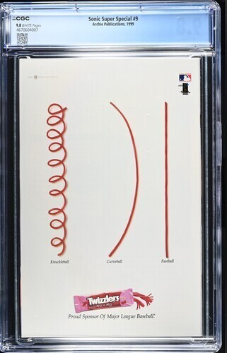 Grade: 9.8 Near Mint/MintSonic Super Special #9 CGC 9.8.You will receive exactly what is pictured in the listing. Items will be shipped extremely carefully to insure they arrive in excellent condition.All S/H for this auction varies. I do combine items for shipping. Insurance is included with all shipping. For International buyers please note any custom fees charged by your country are your responsibility. I will always try to accommodate any special requests.If there are ever any problems regarding your purchase please contact me prior to putting in claims, leaving negative feedback, or giving out low ratings. I aim for 5 out of 5 stars all the time and will always do my best to fix any issues. I always make sure my customers are happy!!!!I ship fast and secure, just check my feedback. Please feel free to E-mail me with any questions or if you need larger scans. Please check out my other auctions!! Happy Bidding. Good Luck.