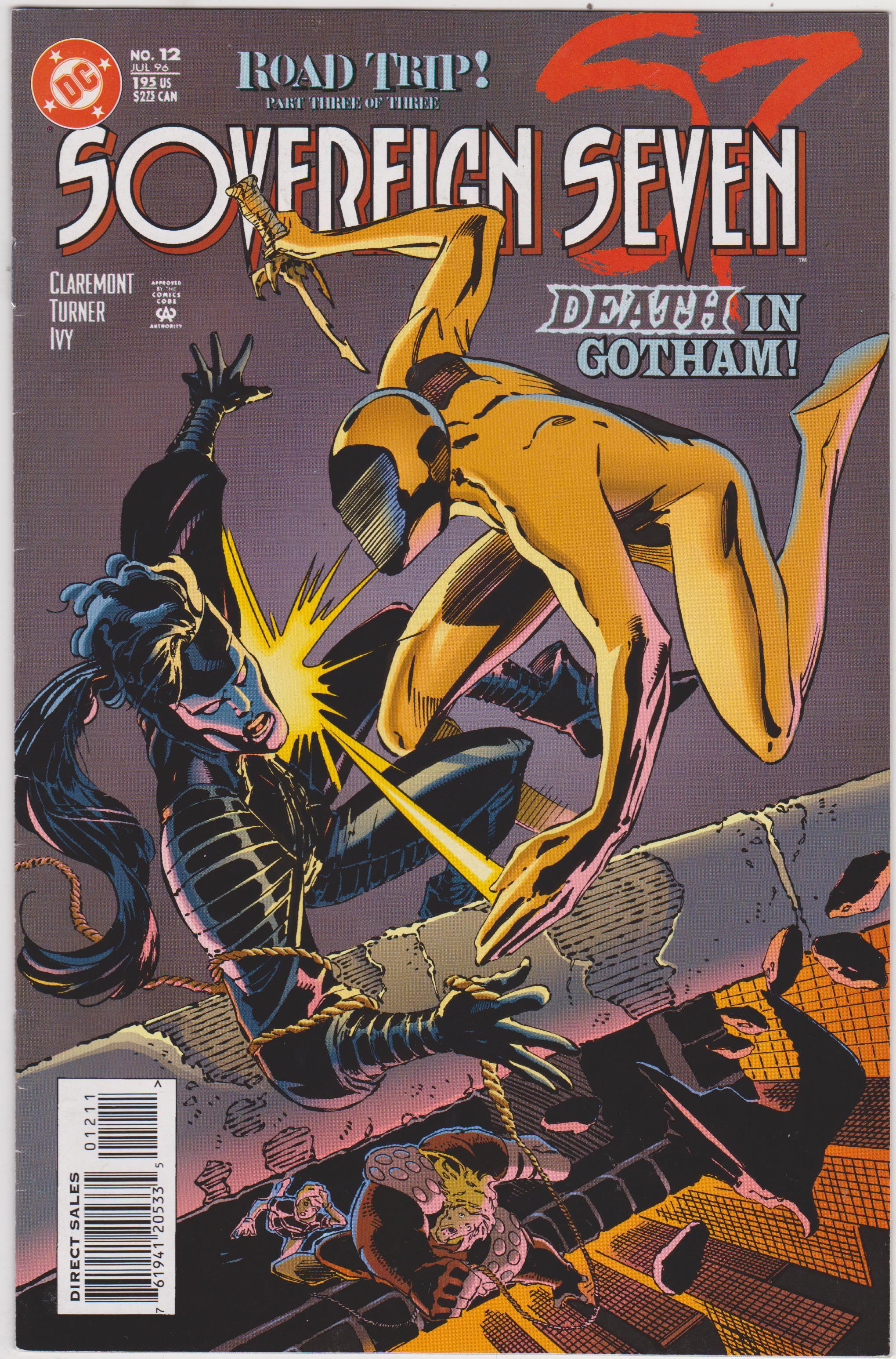 Sovereign Seven #12 by DC Comics copyright 1995. I have graded the comic book, using the Overstreet Grading Guide, at FINE with the following defects: Light stress marks along the spine. The corners are rounded. There is a color scrape in the upper left corner. There is light yellowing of the pages.Seller Information