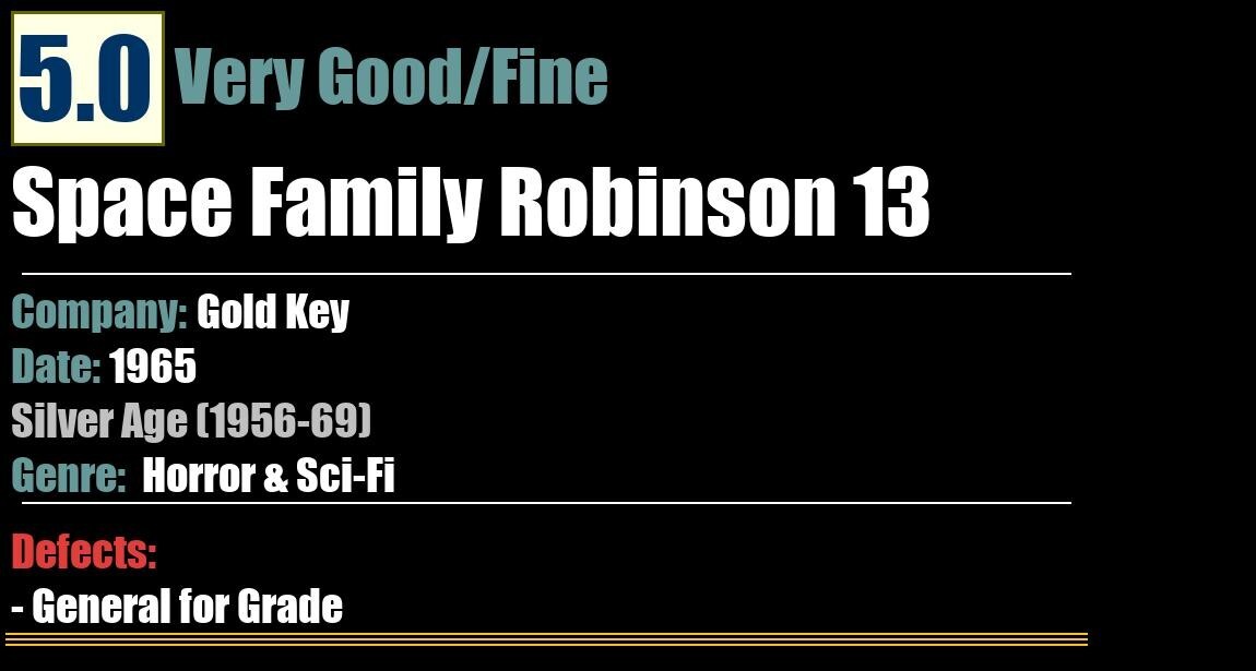 Grade: 5.0 Very Good/Fine Shipping may take up to 5 business daysSpace Family Robinson 13Gold Key - 1965Horror & Sci-FiSilver Age (1956-69)5.0 Very Good/FineDefects:- General for Grade: