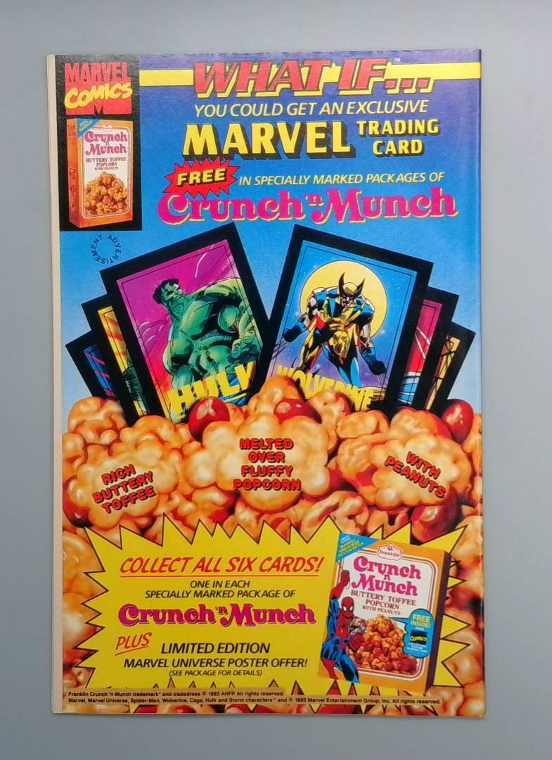 The back cover includes a promotional advertisement for Marvel Trading Cards available in specially marked packages of Crunch 'n Munch cereal, offering collectors the chance to complete a set of six exclusive cards featuring various Marvel characters.