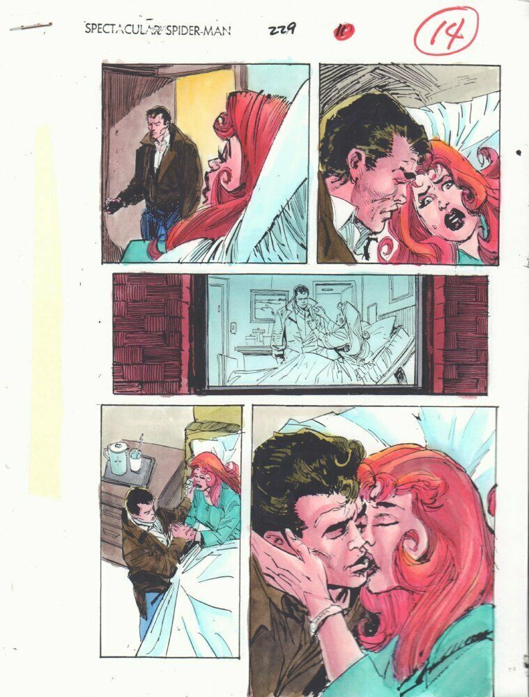 Spectacular Spider-Man #229 p.14 Color Guide Art - Peter & MJ Romance - 1995Sal Buscema pencillerBill Sienkiewicz inkerJohn Kalisz painter"This is a B&W STAT photo copy that the colorist, John Kalisz, painted over to create the published page. This is color art only, the original pencils and inks aren't on here." 9.5" x 11" with some moderate wear along the edges.This item was uploaded by Bobby.If you have any specific questions or requests, please ask us prior to ordering and we'll get back to you as soon as we can. If there are any problems with your order whatsoever, please message us before leaving feedback and we'll be happy to work with you to fix the situation!We ship worldwide, combine purchases, and charge exact shipping. The price may vary based on size, weight, and location. If you are automatically overcharged for shipping, message us and we'll be happy to revise the invoice or refund you the excess amount. If you have any questions regarding shipping, please message us.International Buyers - Please Note: Import duties, taxes, and charges are not included in the item price or shipping cost. These charges are the buyer's responsibility. Please check with your country's customs office to determine what these additional costs will be prior to bidding or buying. Payment can be made by PayPal and credit cards directly. 87,000+ items in total in my Hip store! Frequently Asked Questions: When are your operation hours?Our in office hours are Monday - Friday, 11 am - 9 pm. We are not open on weekends, so if you send us a request on Friday evening we won't get back to you until Monday afternoon. Please don't take it as us ignoring you! We will work on your request Monday and get back to you as soon as we can. Also, if you order from us on a Friday evening or Saturday morning we won't start processing your order until we open on Monday. That means on Monday it will be pulled and prepped for shipping, then picked up by the postman on Tuesday morning.When will you ship my item? The tracking hasn't moved.We realize you're eager to get your item, so if the tracking hasn't moved in a few days please don't be concerned. We give the postman a lot of packages daily, sometimes as many as 100, so he does not scan each item for us upon pickup as he says it would be too time consuming for him to do so. If you get a tracking number from us, that almost always means your item was picked up by the postman the next business day. The USPS is also imperfect. There are times when the tracking won't even show movement until it's in your area's regional distribution center. This is normal in our experience. Is this original artwork? Yes! I am a professional comic book art dealer with 20+ years experience. The image pictured is one of a kind original artwork unless otherwise described. Can you issue a COA? We can, upon request. Please make sure you leave us a note while checking out and shoot us a message immediately after requesting one, just to be sure. What is your base shipping for art? $10 for Domestic, International varies depending on location. Please use Hip's shipping calculator for specifics. How do you ship comics?We ship in rigid cardboard mailers to protect your comic book from the worst the mail system has to offer. Price varies based on the number of books you purchase, but we try to keep costs as low as we can and charge exact shipping. If it looks unusually high to you please send us a message and we'll be happy to double check for you. What is your base shipping for CGC comics? Domestic for CGCs are $10 for the first and $5 for each additional one you add. Do you combine shipping? Yes, of like items. Such as: several comics can fit in one cardboard mailer, as can more than one record. Multiple art pages can easily be combined because they are light and thin. Where combined shipping differs is with size and weight. For instance, two statues require a much bigger box. Same goes for CGCs, as the package gets bigger and heavier as you go. Do you ship well? I've had some bad experiences... You needn't worry; we are professionals who value your business and want your item to arrive safely as much as you do. I have been collecting for over 30 years. I send out items the way I would like to receive them. The tracking says my item is "OUT FOR DELIVERY" in New Jersey. Why is that?If the tracking indicates that the item is "OUT FOR DELIVERY" in NJ don't worry, it's just what the tracking says when it's carried over from the postman to the sorting center. This is normal for our Post Office and will not impact you receiving your item in a timely matter.Have these CGCs had any previous owners? No. I have personally sent in almost all of these to CGC and had them returned to me, offering them fresh to the market for the 1st time. I changed my mind after successfully winning the auction or fixed price listing, will you cancel the transaction? Please only bid or hit BUY IT NOW if you are willing to follow through and pay for the item, we will not cancel the transaction. As a seller, Hip penalizes us every time we cancel an order, so it is detrimental to our business to do so. Therefore if you will not pay, then you'll have to let Hip cycle this to an "unpaid item" and accept whatever action Hip deems necessary. 87,000+ items in total in my Hip store! MEET OUR STAFF: Pictured left to right, my employees: Chris, Connelly, Bobby, & Shannon alongside my family: Sharon, Myself (Anthony), Cameron, AJ, and Jamison SnyderAS SEEN ON TV : I have been buying and selling artwork and comics for about 20 years. If you are new to buying art or comics feel free to ask any questions that you may have. 87,000+ items in total in my Hip store! Small, Regular, and Large Portfolios available; see my Hip store!