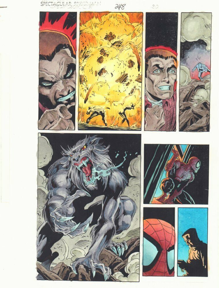 Spectacular Spider-Man #248 p.20 Color Guide Art - Spidey and Man-Wolf - 1997Luke Ross pencillerDan Green inkerJohn Kalisz painter"This is a B&W STAT photo copy that the colorist, John Kalisz, painted over to create the published page. This is color art only, the original pencils and inks aren't on here." 9.5" x 11" with some moderate wear along the edges.This item was uploaded by Bobby.If you have any specific questions or requests, please ask us prior to ordering and we'll get back to you as soon as we can. If there are any problems with your order whatsoever, please message us before leaving feedback and we'll be happy to work with you to fix the situation!We ship worldwide, combine purchases, and charge exact shipping. The price may vary based on size, weight, and location. If you are automatically overcharged for shipping, message us and we'll be happy to revise the invoice or refund you the excess amount. If you have any questions regarding shipping, please message us.International Buyers - Please Note: Import duties, taxes, and charges are not included in the item price or shipping cost. These charges are the buyer's responsibility. Please check with your country's customs office to determine what these additional costs will be prior to bidding or buying. Payment can be made by PayPal and credit cards directly. 87,000+ items in total in my Hip store! Frequently Asked Questions: When are your operation hours?Our in office hours are Monday - Friday, 11 am - 9 pm. We are not open on weekends, so if you send us a request on Friday evening we won't get back to you until Monday afternoon. Please don't take it as us ignoring you! We will work on your request Monday and get back to you as soon as we can. Also, if you order from us on a Friday evening or Saturday morning we won't start processing your order until we open on Monday. That means on Monday it will be pulled and prepped for shipping, then picked up by the postman on Tuesday morning.When will you ship my item? The tracking hasn't moved.We realize you're eager to get your item, so if the tracking hasn't moved in a few days please don't be concerned. We give the postman a lot of packages daily, sometimes as many as 100, so he does not scan each item for us upon pickup as he says it would be too time consuming for him to do so. If you get a tracking number from us, that almost always means your item was picked up by the postman the next business day. The USPS is also imperfect. There are times when the tracking won't even show movement until it's in your area's regional distribution center. This is normal in our experience. Is this original artwork? Yes! I am a professional comic book art dealer with 20+ years experience. The image pictured is one of a kind original artwork unless otherwise described. Can you issue a COA? We can, upon request. Please make sure you leave us a note while checking out and shoot us a message immediately after requesting one, just to be sure. What is your base shipping for art? $10 for Domestic, International varies depending on location. Please use Hip's shipping calculator for specifics. How do you ship comics?We ship in rigid cardboard mailers to protect your comic book from the worst the mail system has to offer. Price varies based on the number of books you purchase, but we try to keep costs as low as we can and charge exact shipping. If it looks unusually high to you please send us a message and we'll be happy to double check for you. What is your base shipping for CGC comics? Domestic for CGCs are $10 for the first and $5 for each additional one you add. Do you combine shipping? Yes, of like items. Such as: several comics can fit in one cardboard mailer, as can more than one record. Multiple art pages can easily be combined because they are light and thin. Where combined shipping differs is with size and weight. For instance, two statues require a much bigger box. Same goes for CGCs, as the package gets bigger and heavier as you go. Do you ship well? I've had some bad experiences... You needn't worry; we are professionals who value your business and want your item to arrive safely as much as you do. I have been collecting for over 30 years. I send out items the way I would like to receive them. The tracking says my item is "OUT FOR DELIVERY" in New Jersey. Why is that?If the tracking indicates that the item is "OUT FOR DELIVERY" in NJ don't worry, it's just what the tracking says when it's carried over from the postman to the sorting center. This is normal for our Post Office and will not impact you receiving your item in a timely matter.Have these CGCs had any previous owners? No. I have personally sent in almost all of these to CGC and had them returned to me, offering them fresh to the market for the 1st time. I changed my mind after successfully winning the auction or fixed price listing, will you cancel the transaction? Please only bid or hit BUY IT NOW if you are willing to follow through and pay for the item, we will not cancel the transaction. As a seller, Hip penalizes us every time we cancel an order, so it is detrimental to our business to do so. Therefore if you will not pay, then you'll have to let Hip cycle this to an "unpaid item" and accept whatever action Hip deems necessary. 87,000+ items in total in my Hip store! MEET OUR STAFF: Pictured left to right, my employees: Chris, Connelly, Bobby, & Shannon alongside my family: Sharon, Myself (Anthony), Cameron, AJ, and Jamison SnyderAS SEEN ON TV : I have been buying and selling artwork and comics for about 20 years. If you are new to buying art or comics feel free to ask any questions that you may have. 87,000+ items in total in my Hip store! Small, Regular, and Large Portfolios available; see my Hip store!