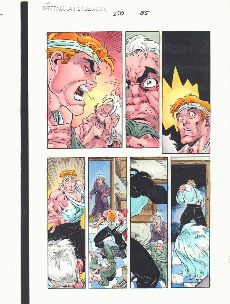 Spectacular Spider-Man #250 p.35 Color Guide Art - Harrison and Flash Thompson - 1997Luke Ross pencillerDan Green inkerJohn Kalisz painter"This is a B&W STAT photo copy that the colorist, John Kalisz, painted over to create the published page. This is color art only, the original pencils and inks aren't on here." 9.5" x 11" with some moderate wear along the edges.This item was uploaded by Bobby.If you have any specific questions or requests, please ask us prior to ordering and we'll get back to you as soon as we can. If there are any problems with your order whatsoever, please message us before leaving feedback and we'll be happy to work with you to fix the situation!We ship worldwide, combine purchases, and charge exact shipping. The price may vary based on size, weight, and location. If you are automatically overcharged for shipping, message us and we'll be happy to revise the invoice or refund you the excess amount. If you have any questions regarding shipping, please message us.International Buyers - Please Note: Import duties, taxes, and charges are not included in the item price or shipping cost. These charges are the buyer's responsibility. Please check with your country's customs office to determine what these additional costs will be prior to bidding or buying. Payment can be made by PayPal and credit cards directly. 87,000+ items in total in my Hip store! Frequently Asked Questions: When are your operation hours?Our in office hours are Monday - Friday, 11 am - 9 pm. We are not open on weekends, so if you send us a request on Friday evening we won't get back to you until Monday afternoon. Please don't take it as us ignoring you! We will work on your request Monday and get back to you as soon as we can. Also, if you order from us on a Friday evening or Saturday morning we won't start processing your order until we open on Monday. That means on Monday it will be pulled and prepped for shipping, then picked up by the postman on Tuesday morning.When will you ship my item? The tracking hasn't moved.We realize you're eager to get your item, so if the tracking hasn't moved in a few days please don't be concerned. We give the postman a lot of packages daily, sometimes as many as 100, so he does not scan each item for us upon pickup as he says it would be too time consuming for him to do so. If you get a tracking number from us, that almost always means your item was picked up by the postman the next business day. The USPS is also imperfect. There are times when the tracking won't even show movement until it's in your area's regional distribution center. This is normal in our experience. Is this original artwork? Yes! I am a professional comic book art dealer with 20+ years experience. The image pictured is one of a kind original artwork unless otherwise described. Can you issue a COA? We can, upon request. Please make sure you leave us a note while checking out and shoot us a message immediately after requesting one, just to be sure. What is your base shipping for art? $10 for Domestic, International varies depending on location. Please use Hip's shipping calculator for specifics. How do you ship comics?We ship in rigid cardboard mailers to protect your comic book from the worst the mail system has to offer. Price varies based on the number of books you purchase, but we try to keep costs as low as we can and charge exact shipping. If it looks unusually high to you please send us a message and we'll be happy to double check for you. What is your base shipping for CGC comics? Domestic for CGCs are $10 for the first and $5 for each additional one you add. Do you combine shipping? Yes, of like items. Such as: several comics can fit in one cardboard mailer, as can more than one record. Multiple art pages can easily be combined because they are light and thin. Where combined shipping differs is with size and weight. For instance, two statues require a much bigger box. Same goes for CGCs, as the package gets bigger and heavier as you go. Do you ship well? I've had some bad experiences... You needn't worry; we are professionals who value your business and want your item to arrive safely as much as you do. I have been collecting for over 30 years. I send out items the way I would like to receive them. The tracking says my item is "OUT FOR DELIVERY" in New Jersey. Why is that?If the tracking indicates that the item is "OUT FOR DELIVERY" in NJ don't worry, it's just what the tracking says when it's carried over from the postman to the sorting center. This is normal for our Post Office and will not impact you receiving your item in a timely matter.Have these CGCs had any previous owners? No. I have personally sent in almost all of these to CGC and had them returned to me, offering them fresh to the market for the 1st time. I changed my mind after successfully winning the auction or fixed price listing, will you cancel the transaction? Please only bid or hit BUY IT NOW if you are willing to follow through and pay for the item, we will not cancel the transaction. As a seller, Hip penalizes us every time we cancel an order, so it is detrimental to our business to do so. Therefore if you will not pay, then you'll have to let Hip cycle this to an "unpaid item" and accept whatever action Hip deems necessary. 87,000+ items in total in my Hip store! MEET OUR STAFF: Pictured left to right, my employees: Chris, Connelly, Bobby, & Shannon alongside my family: Sharon, Myself (Anthony), Cameron, AJ, and Jamison SnyderAS SEEN ON TV : I have been buying and selling artwork and comics for about 20 years. If you are new to buying art or comics feel free to ask any questions that you may have. 87,000+ items in total in my Hip store! Small, Regular, and Large Portfolios available; see my Hip store!