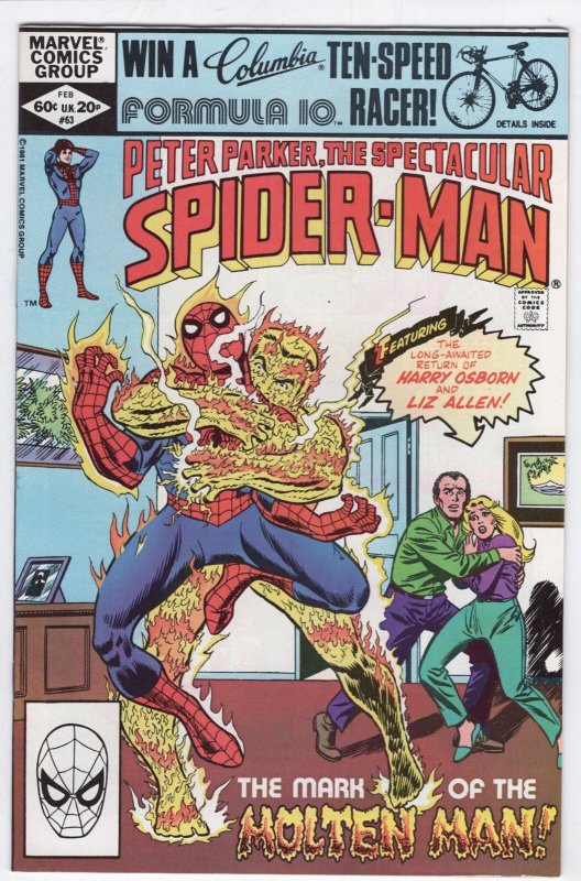 SPECTACULAR SPIDER-MAN #63 - 7.0 - WP - VS Molten Man DESCRIPTION:This very sharp, unrestored copy is complete, fully readable and has both covers attached. The book has very high cover gloss, a very tight spine and white pages. This book features Spider-Man versus Molten Man. The book is sent in a mylar sleeve with a backing board. Condition is a very conservatively graded 7.0, FN-VFN.SHIPPING INFORMATION:Combine our auctions and $ave on shipping!Please remember that Media Rate may take up to 4 weeks delivery.FEDEX services available.Nevada residents, please add sales tax.We accept PayPal, MasterCard, Visa, Discover, American Express.NOTES AND FINE PRINT: Welcome to Redbeard's Book Den! For most that have collected comic books for the last 30 years, you have probably heard of us. Redbeard's founder and current owner is Ron Pussell (aka Redbeard), senior Overstreet Price Guide consultant since 1980.REDBEARD'S BOOK DENPO Box 217Crystal Bay, NV 89402-0217 _gsrx_vers_1730 (GS 9.9.4 (1730))