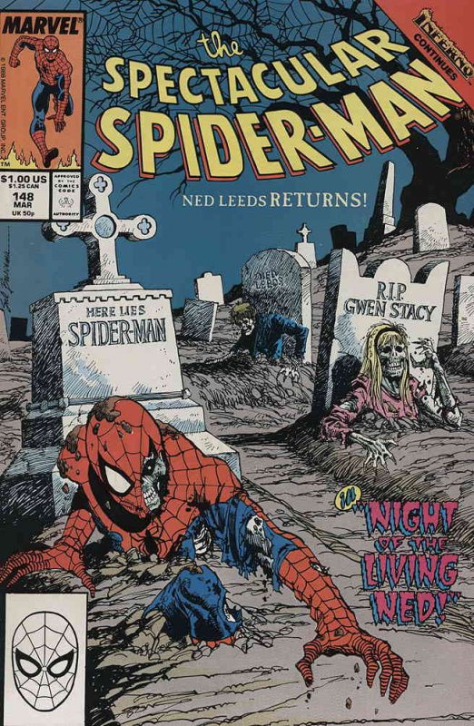 Item: Spectacular Spider-Man, The #148 | Publisher: Marvel | Cover Date: March 1989 | Writer: Gerry Conway | Artist: Sal Buscema | Cover Artist: Sal Buscema | Appearances: Spider-Man, Flash Thompson, Betty Brant | Storylines: Inferno, Part 3; Night of the Living Ned! | Notes: Inferno crossover; Inferno tie-in | With Economy shipping, each additional comic ships for just 50 cents more to customers in the USA. This listing contains a stock photo and information from ComicBase™ and © Human Computing. The stock photo is for reference only. If you would like to see a photo of the actual item, please message us prior to purchasing.Seller Information