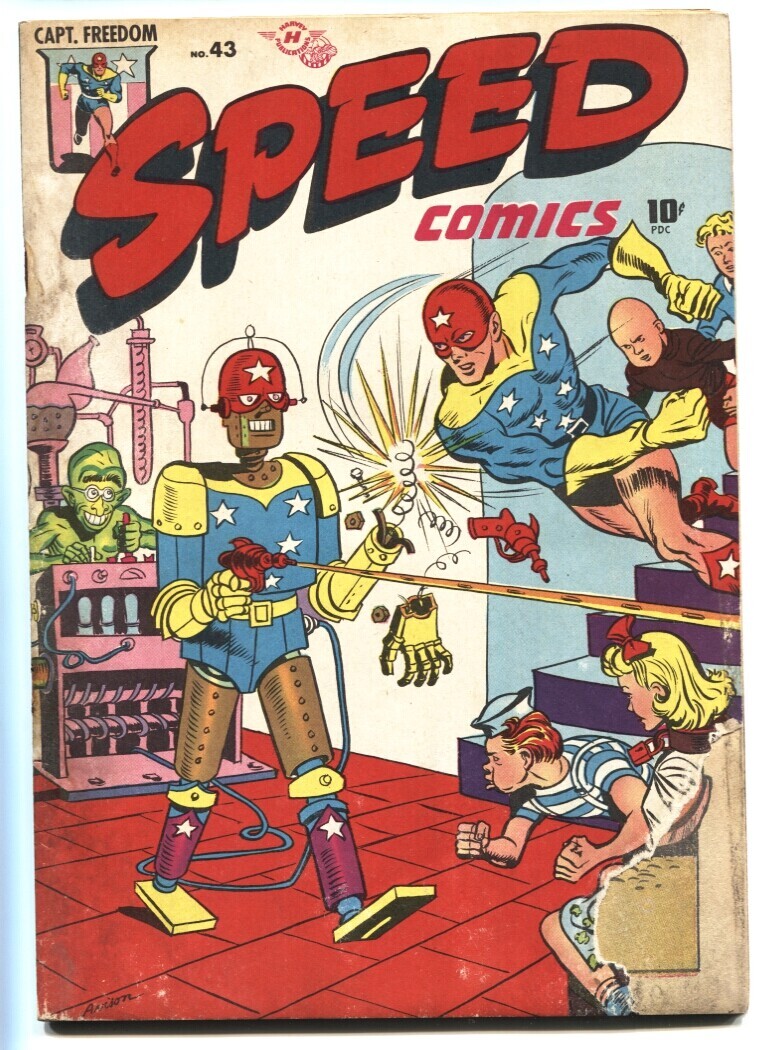 Grade: G Speed #43 1946-Harvey-Captain Freedom ROBOT cover G Robot cover. Al Avison cover, Joe Kubert and Bob Powell art. Moisture damage. Heavy staple rust. Grade: G SKU: U2-157-008