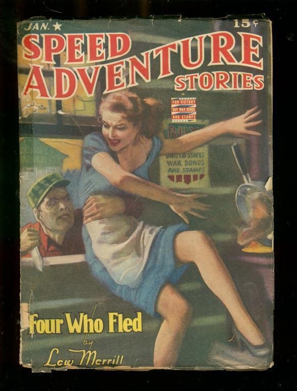 Speed adventure stories-jan 1943-wild pulp terror cover vg knife wielding villain grabs terrified woman on this racy h j ward cover. Loaded with hard boiled pulp thrills, lew merrill, e hoffman price stories. 1943 grade: vg sku: ps01-03-086