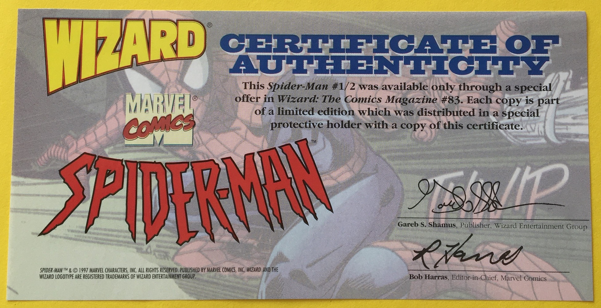 Wizard 1/2 edition with certificate of authenticitySpider-man 1/2 from marvel comics. high grade copy complete no markings see pic of actual book up for sale before purchasing. Safe fast shipping $5.00 first class mail heavy cardboard used with bubblewrap. Combine purchases to save on shipping. Paypal accepted.