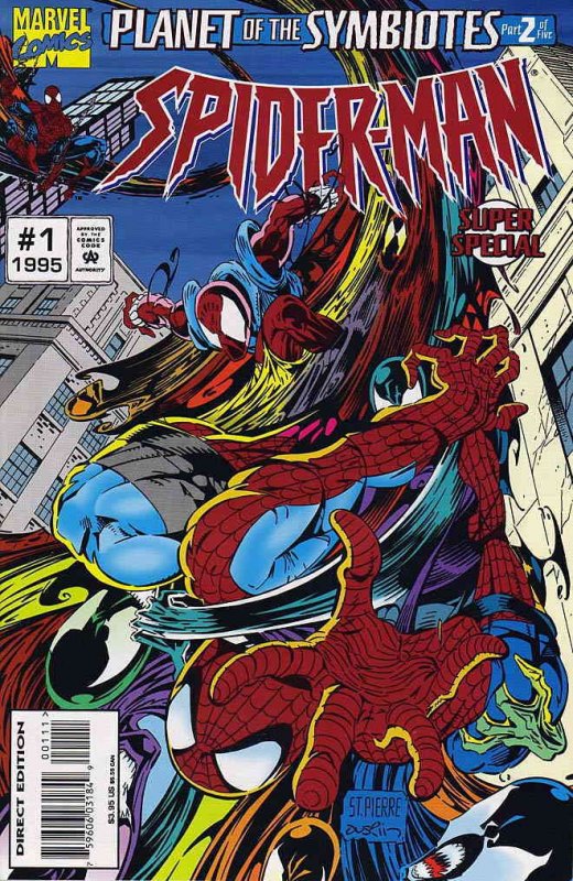 Item: Spider-Man Super Special #1 | Publisher: Marvel | Cover Date: July 1995 | Writer: David Michelinie, Darick Robertson, Terry Kavanagh | Artist: Joe St. Pierre, Darick Robertson, Tod Smith | Cover Artist: Joe St. Pierre, Darick Robertson | Appearances: Spider-Man, Scarlet Spider, Strongarm, Venom, Carnage, Lizard, Mary Jane Parker | Storylines: Planet of the Symbiotes, Part 2; Lurkers; Till Death Do Us Part; Growing Pains, Part 2; Survive and Conquer | Notes: Two of the stories continue in Venom Super Special #1; Flip-book; Flipbook | With Economy shipping, each additional comic ships for just 50 cents more to customers in the USA. This listing contains a stock photo and information from ComicBase™ and © Human Computing. The stock photo is for reference only. If you would like to see a photo of the actual item, please message us prior to purchasing.Seller Information