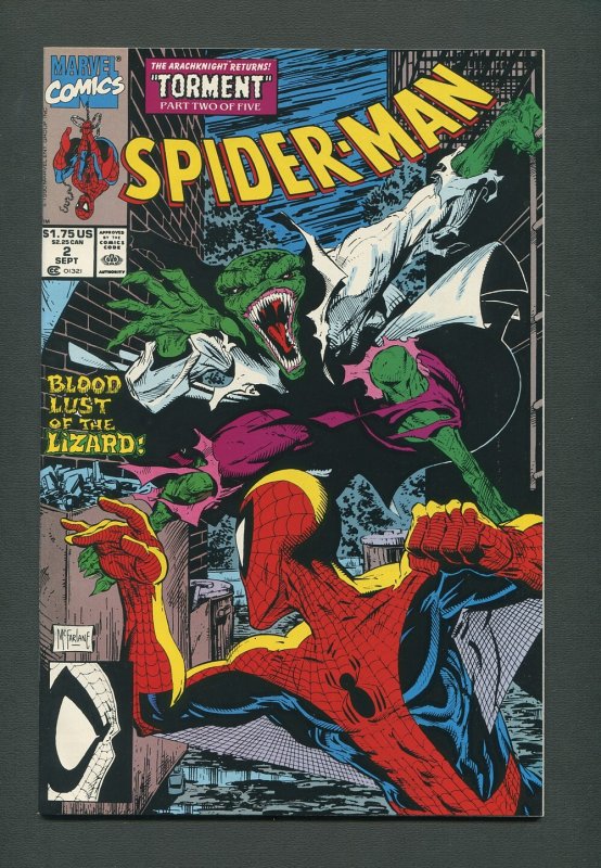 Torment: Part 2 of 5. "Blood Lust of the Lizard!" Story, art and cover by Todd McFarlane. Spidey comes face-to-face with the Lizard, but this time it's different. His erstwhile adversary has never been this savage, this animalistic before. Can Spider-Man survive an encounter with an even deadlier Lizard? And, who is behind the mysterious drums in the distance that have inspired this attack?