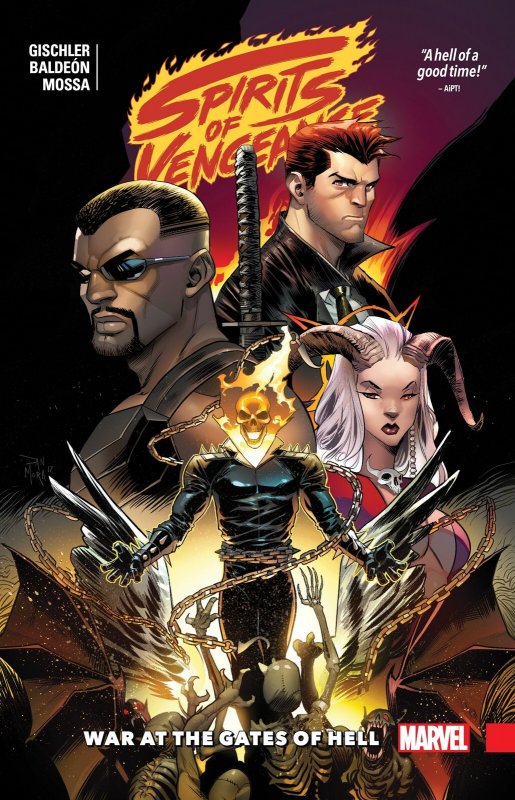 SPIRITS OF VENGEANCE: WAR AT THE GATES OF HELL Collects Spirits of Vengeance #1-5. A dead angel. A silver bullet. A kept promise. For ages, the war between Heaven and Hell raged in the unseen corners of society, with both sides in delicate balance. But when an undercover angel is murdered, the scales are tipped. Now, Johnny Blaze must find the killers and punish them - but he won't do it alone. A deadly team rises from the darkest depths of the Marvel Universe to form an unholy alliance: Ghost Rider! Hellstorm! Satana! Blade! They are the Spirits of Vengeance - and they must unravel a plot against God himself. The forces of Necrodamus mean to unleash a deicidal rampage not seen since the Old Testament. As the drums of war beat louder and louder, only the Spirits of Vengeance stand between the armies of Heaven and Hell! Features Details Fast and Free Shipping You're already purchasing the item. Why pay additional for shipping, especially slow shipping? We get your order shipped out within 1-business day and delivered to your doorstep as quickly as possible. Competitive Pricing With our dynamic pricing model, our prices are always competitive. Our prices are some of the lowest that you will find on the internet. Rest assured that you're getting a good deal when purchasing with us. 30-day Money Back Guarantee We are committed to making sure that you leave this transaction satisfied. If you're unhappy with the product for any reason, you may return it back for your money-back or a replacement within 30 days. No questions asked!Seller Information