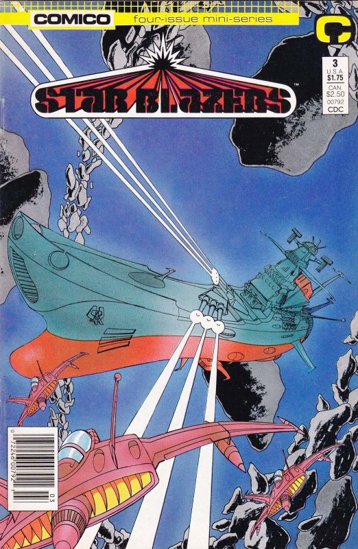 Item: Star Blazers #3 (Newsstand) | Publisher: COMICO | Cover Date: June 1987 | Writer: Phil Foglio, Doug Rice | Artist: Doug Rice | Cover Artist: Doug Rice | Appearances: Star Blazers | Storylines: Target—Argo | Notes: Wraparound cover; newsstand edition | With Economy shipping, each additional comic ships for just 50 cents more to customers in the USA. This listing contains a stock photo and information from ComicBase™ and © Human Computing. The stock photo is for reference only. If you would like to see a photo of the actual item, please message us prior to purchasing.Seller Information