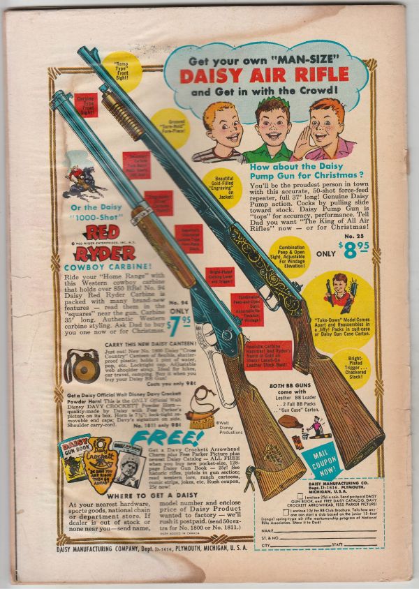This book has nice rich color on this all-time-classic cover and would grade much higher if not for a large stain at the outer-edges of the back cover and inside front cover's outer-edges as well. We have adjusted the grade accordingly. There is a name stamp on the cover.