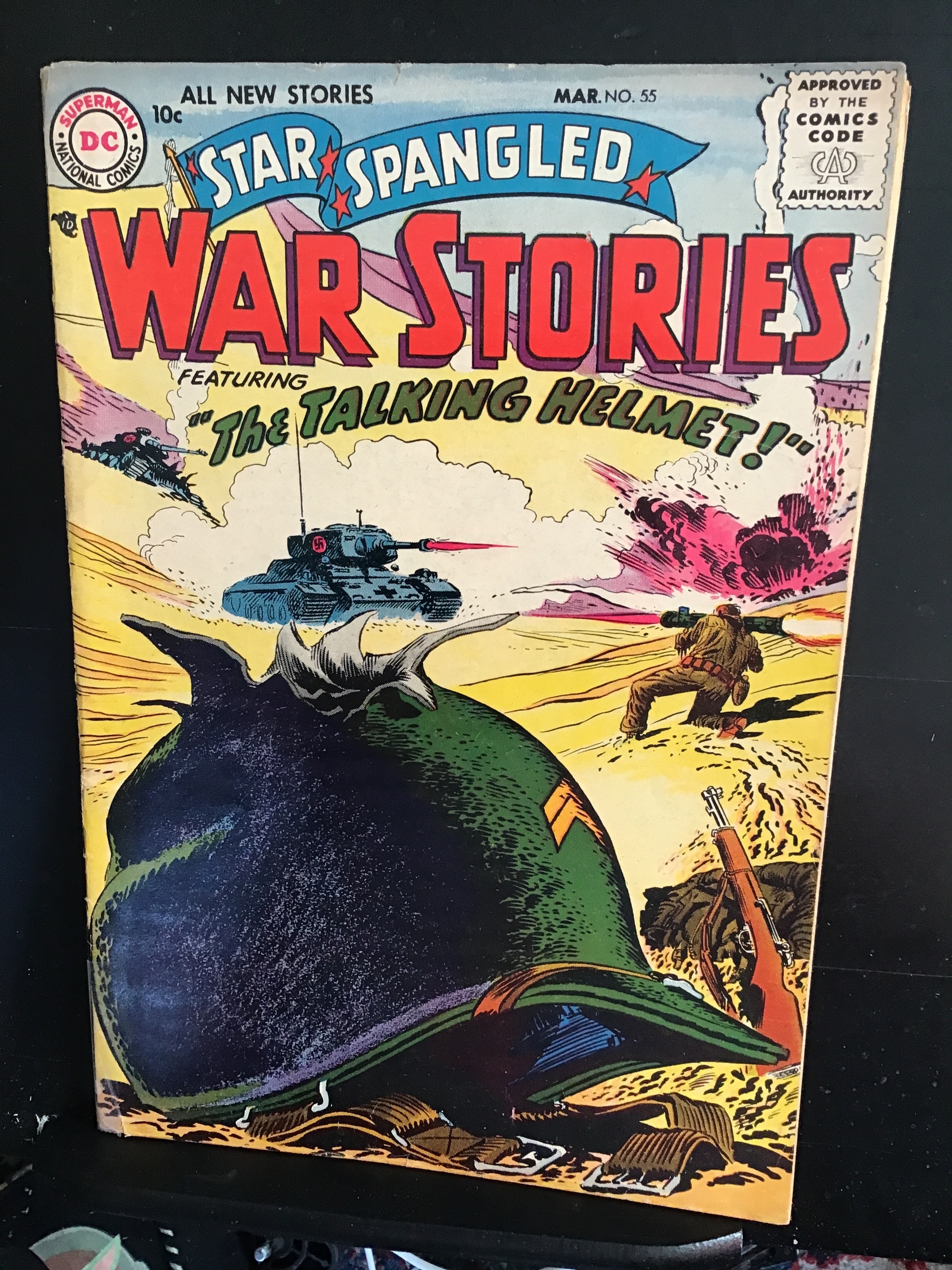 Star Spangled War Stories #55 (1957) This book has deep rich color and stunning eye-appeal on this all time classic DC War cover. With cream/slight heavy cream tint pages and inside covers. The book is well attached at the spine and the centerfold at the staples. With overall very minimal light wear outside the page quality and a Then 1 inch tape seal at the base of the spine due to a split. With light wear appropriate to grade.. We have adjusted the grade accordingly for the page quality etc.Seller Information