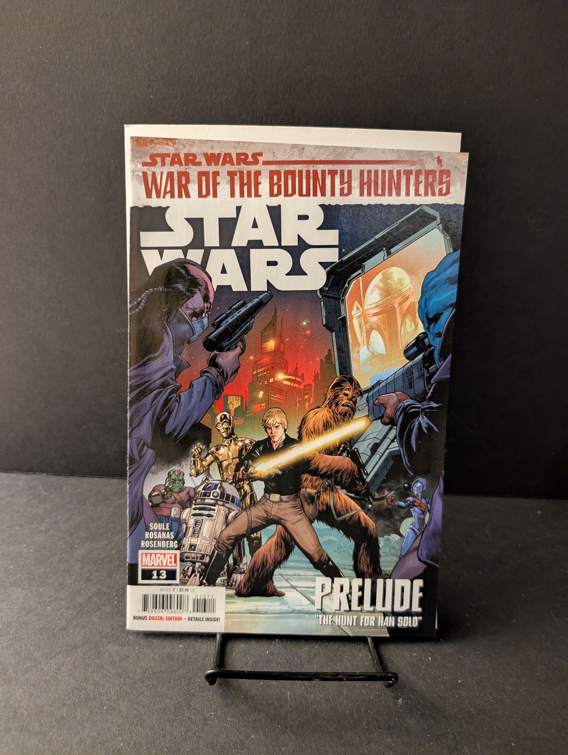 Written by Charles Soule. Art by Ramon Rosanas. Cover by Carlo Pagulayan and Jason Paz. PRELUDE TO WAR OF THE BOUNTY HUNTERS: 'THE HUNT FOR HAN'. CHEWBACCA has heard from an old friend with intelligence on the location of notorious bounty hunter BOBA FETT, known to be in possession of HAN SOLO. Along with LUKE SKYWALKER, the loyal Wookiee sets off in search of his lost friend, on an adventure to Nar Shadaa... the SMUGGLER'S MOON! But will this mission prevent plucky astromech droid ARTOO DETOO from passing along a crucial message to Luke, one that will affect the fate of the entire Jedi Order...? 28 pages, full color. Rated T Cover price $3.99.Seller Information