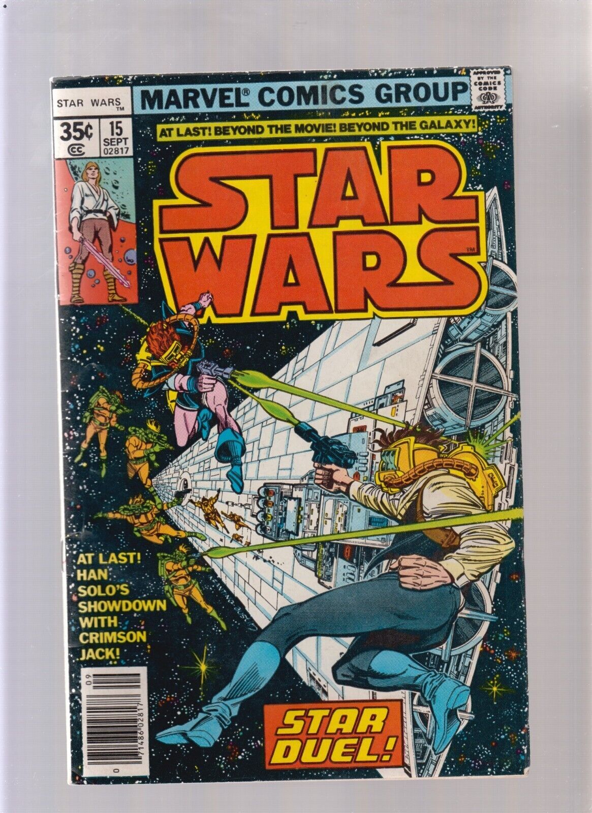 Star Wars #15 - Newsstand (FN-) 1978Size: 7" x 10"This item was uploaded by __AS__.WE COMBINE SHIPPING!!! Either wait for us to send you an invoice after you commit to buy or, if it makes you pay right away, message us back and we'll refund the excess charge. Buy as many single comic books as you want for one low flat shipping rate in the United States! International will be charged exact according to size and weight. If you have any specific questions or requests, please ask us prior to ordering and we'll get back to you as soon as we can. If there are any problems with your order whatsoever, please message us before leaving feedback and we'll be happy to work with you to fix the situation! We ship worldwide, combine purchases, and charge exact shipping. The price may vary based on size, weight, and location. If you are automatically overcharged for shipping, message us and we'll be happy to revise the invoice or refund you the excess amount. If you have any questions regarding shipping, please message us. International Buyers - Please Note: Import duties, taxes, and charges are not included in the item price or shipping cost. These charges are the buyer's responsibility. Please check with your country's customs office to determine what these additional costs will be prior to bidding or buying. Payment can be made by PayPal and credit cards directly. 120,000+ items in total in my Hip store! Frequently Asked Questions: When are your operation hours?Our in office hours are Monday - Friday, 11 am - 8 pm. We are not open on weekends, so if you send us a request on Friday evening we won't get back to you until Monday afternoon. Please don't take it as us ignoring you! We will work on your request Monday and get back to you as soon as we can. Also, if you order from us on a Friday evening or Saturday morning we won't start processing your order until we open on Monday. That means on Monday it will be pulled and prepped for shipping, then picked up by the postman on Tuesday morning.When will you ship my item? The tracking hasn't moved.We realize you're eager to get your item, so if the tracking hasn't moved in a few days please don't be concerned. We give the postman a lot of packages daily, sometimes as many as 100, so he does not scan each item for us upon pickup as he says it would be too time consuming for him to do so. If you get a tracking number from us, that almost always means your item was picked up by the postman the next business day. The USPS is also imperfect. There are times when the tracking won't even show movement until it's in your area's regional distribution center. This is normal in our experience. Is the item pictured the exact one for sale?Yes! We don't use stock images and go through great lengths to scan or photograph everything we list. The item pictured is exactly what you should receive UNLESS it is a fixed price listing with multiple items available. Can you issue a COA? We can, upon request. Please make sure you leave us a note while checking out and shoot us a message immediately after requesting one, just to be sure. How do you grade?Grading is very subjective, but we are professionals with decades of grading experience between us who try the best we can to accurately describe the condition of the items we list. Anthony is an Overstreet Comic Book Price Guide Advisor Please see the grading chart below for a breakdown of how we grade: NOTE: We don't grade any raw books higher than 9.2, as once you go higher than that grading gets really subjective. If you buy a NM book from us, it may very well be higher than 9.2 but we play it safe and grade conservatively. 9.2 NM Near Mint 9.0 VF/NM Very Fine/Near Mint 8.5 VF+ Very Fine+ 8.0 VF Very Fine 7.5 VF- Very Fine- 7.0 FN/VF Fine/Very Fine 6.5 FN+ Fine+ 6.0 FN Fine 5.5 FN- Fine- 5.0 VG/FN Very Good/Fine 4.5 VG+ Very Good+ 4.0 VG Very Good 3.5 VG- Very Good- 3.0 GD/VG Good/Very Good 2.5 GD+ Good+ 2.0 GD Good 1.8 GD- Good- 1.5 FR/GD Fair/Good 1.0 FR Fair 0.5 PR PoorHow do you ship comics? We ship in rigid cardboard mailers to protect your comic book from the worst the mail system has to offer. Price varies based on the number of books you purchase, but we try to keep costs as low as we can and charge exact shipping. If it looks unusually high to you please send us a message and we'll be happy to double check for you. Do you combine shipping? Yes, of like items. Such as: several comics can fit in one cardboard mailer, as can more than one record. Multiple art pages can easily be combined because they are light and thin. Where combined shipping differs is with size and weight. For instance, two statues require a much bigger box. Same goes for CGCs, as the package gets bigger and heavier as you go. Do you ship well? I've had some bad experiences... You needn't worry; we are professionals who value your business and want your item to arrive safely as much as you do. I have been collecting for over 30 years. I send out items the way I would like to receive them. The tracking says my item is "OUT FOR DELIVERY" in New Jersey. Why is that?If the tracking indicates that the item is "OUT FOR DELIVERY" in NJ don't worry, it's just what the tracking says when it's carried over from the postman to the sorting center. This is normal for our Post Office and will not impact you receiving your item in a timely matter.What is the difference between a RUN and a LOT?Good question. A RUN will be a collection of consecutive issues with no breaks in between them. If it says RUN of #s 1 - 50 you will receive 50 consecutive comics. A LOT will be within a certain range, so a 50pc LOT will not contain consecutive books.I changed my mind after successfully winning the auction or fixed price listing, will you cancel the transaction? Please only bid or hit BUY IT NOW if you are willing to follow through and pay for the item, we will not cancel the transaction. As a seller, Hip penalizes us every time we cancel an order, so it is detrimental to our bu