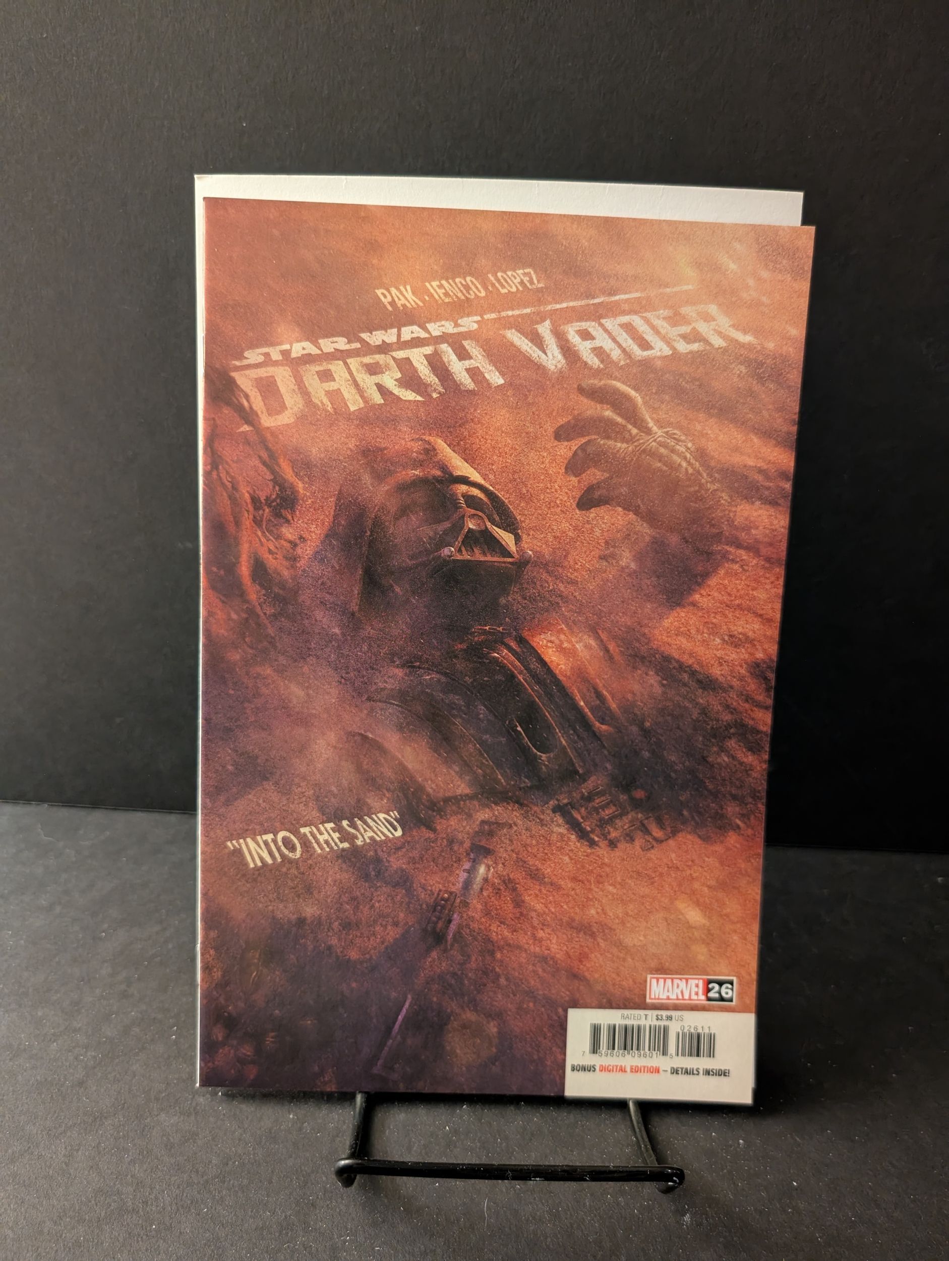 Written by Greg Pak. Art by Raffaele Ienco. Cover by Rahzzah. INTO THE SAND! We all know about Anakin Skywalker's aversion to finely ground particulate matter. But what does sand mean to the Dark Lord of the Sith? When Sabé, Vader's unlikely new ally, goes missing, Vader must confront his own dark heart in the maelstrom of a terrible sandstorm - while tapping into one of his earliest skills in a wildly unexpected way! 28 pages, full color. RATED T Cover price $3.99.Seller Information