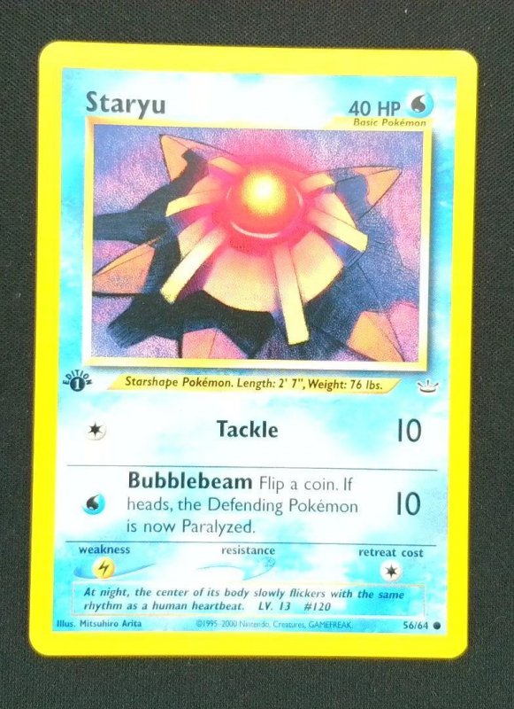 Staryu (#56/64) is a Water-type Basic Pokemon from the Neo Revelation set, featuring 40 HP and two attacks: Tackle and Bubblebeam. This starfish-shaped Pokemon card offers a strategic gameplay option with its coin f ... Read More