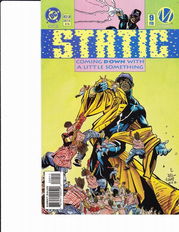 Static #9 by DC Comics copyright 1993. I have graded the comic book, using the Overstreet Grading Guide, at FINE+ with the following defects: Light stress marks along the spine. The corners are rounded. There is yellowing of the pages.