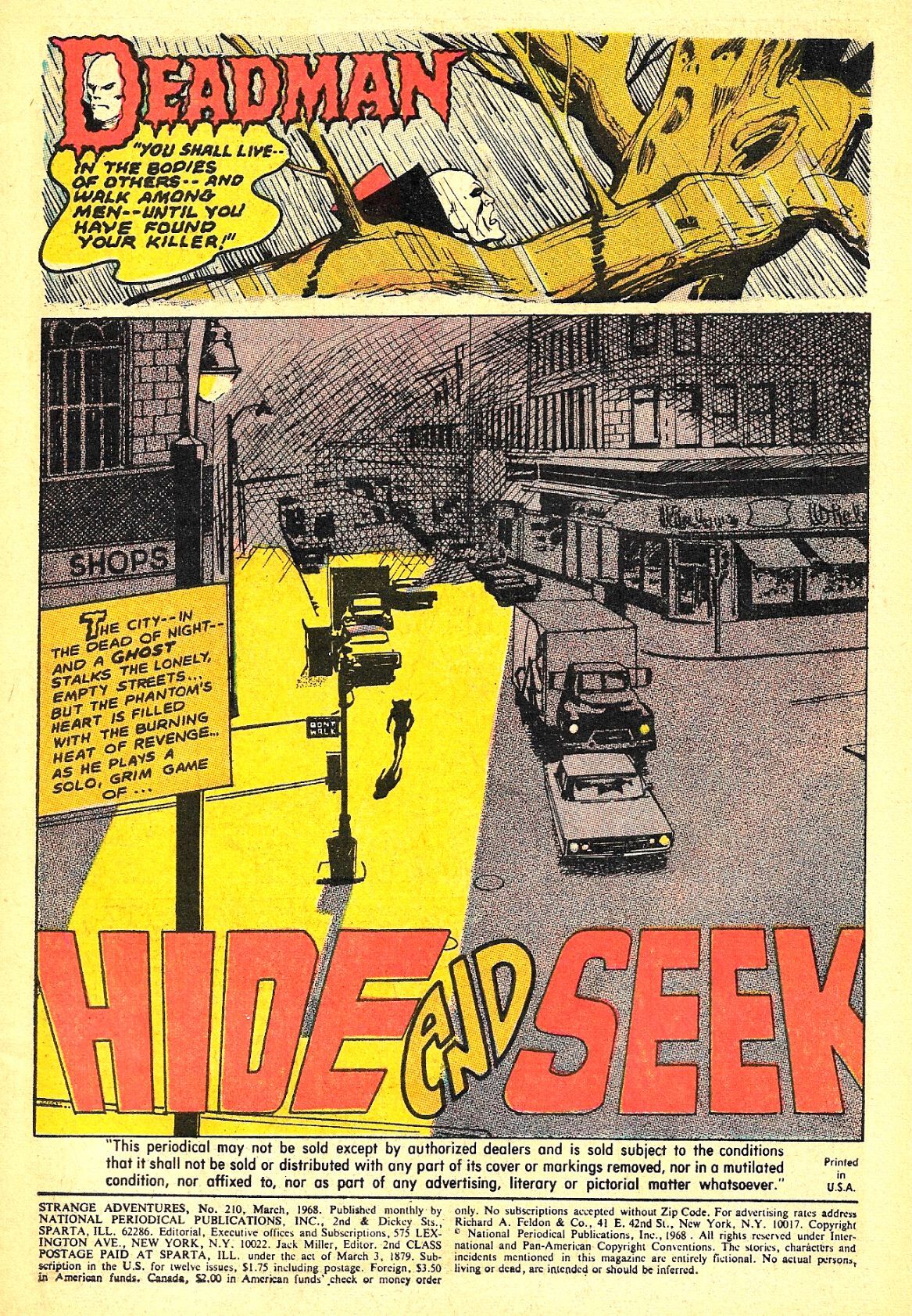 DEADMAN (who in life was Boston Brand) first appeared in STRANGE ADVENTURES #205 (October 1967), and was created by Arnold Drake and Carmine Infantino. Two issues later, the art chores were taken over by the artist best-known for his association with DEADMAN -- the masterly NEAL ADAMS! He illustrated the remaining 11 issues of DEADMAN's first story arc.Here in Adams' fourth installment of his DEADMAN saga, "Hide and Seek!", both written and illustrated by Adams himself, DEADMAN seeks to learn what has happened to the police detective assigned to his case. He discovers that the detective, Mike Riley, has been falsely accused of brutally beating a thief who had already surrendered to him, and has been kicked off the force.