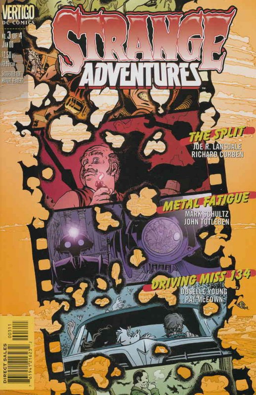 Item: Strange Adventures (3rd Series) #3 | Publisher: DC/Vertigo | Cover Date: January 2000 | Writer: Doselle Young, Joe Lansdale, Mark Schultz | Artist: John Toteben, Pat McEown, Richard Corben | Cover Artist: Edvin Biukovic | Storylines: The Split; Driving Miss 134; Metal Fatigue | With Economy shipping, each additional comic ships for just 50 cents more to customers in the USA. This listing contains a stock photo and information from ComicBase™ and © Human Computing. The stock photo is for reference only. If you would like to see a photo of the actual item, please message us prior to purchasing.Seller Information
