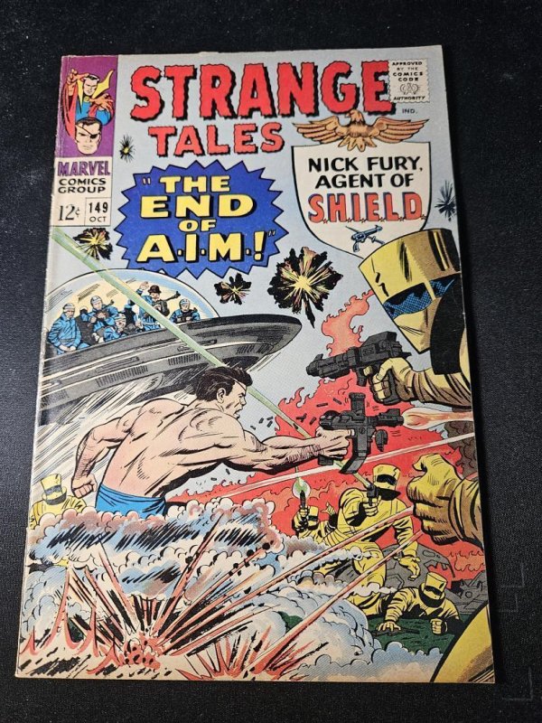 In "Strange Tales" #149, Nick Fury confronts A.I.M. in a thrilling showdown titled "The End of A.I.M.!" This issue features a classic battle as Fury takes on the technology-driven villains. The comic highlights espionage and action, typical of the SHIELD storylines. The condition appears good with only minor wear along the edges.