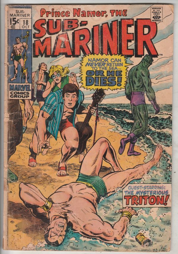 Sub-Mariner #18 -This book has deep rich color on this all-time-classic Namor vs. Triton of Inhumans cover. With small chips at the outer-edge of the front cover and general wear appropriate to grade. There is a short thin tape-seal on the outer-edge of the right center-fold page which we almost missed. The staples are attached at the spine and the center-fold.