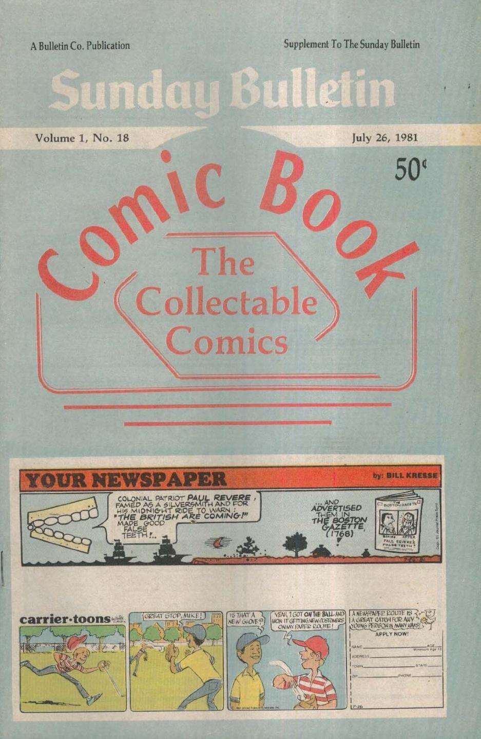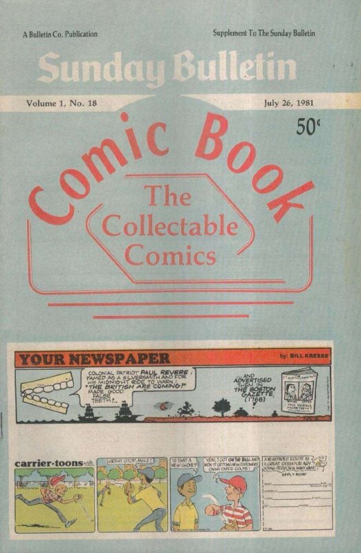 Item: Sunday Bulletin Collectable Comics #18 | Publisher: Bulletin Co | Cover Date: July 1981 | Appearances: Shoe, Peanuts, Doonesbury, Superman, Andy Capp, Wizard of Id, Star Trek, B.C., Star Wars, Family Circus, Spider-Man, Beetle Bailey, Garfield, Nancy, Herman, Tarzan, Prince Valiant, Dennis the Menace, Annie, Hagar the Horrible, the Phantom, Blondie | With Economy shipping, each additional comic ships for just 50 cents more to customers in the USA. This listing contains a stock photo and information from ComicBase™ and © Human Computing. The stock photo is for reference only. If you would like to see a photo of the actual item, please message us prior to purchasing.Seller Information