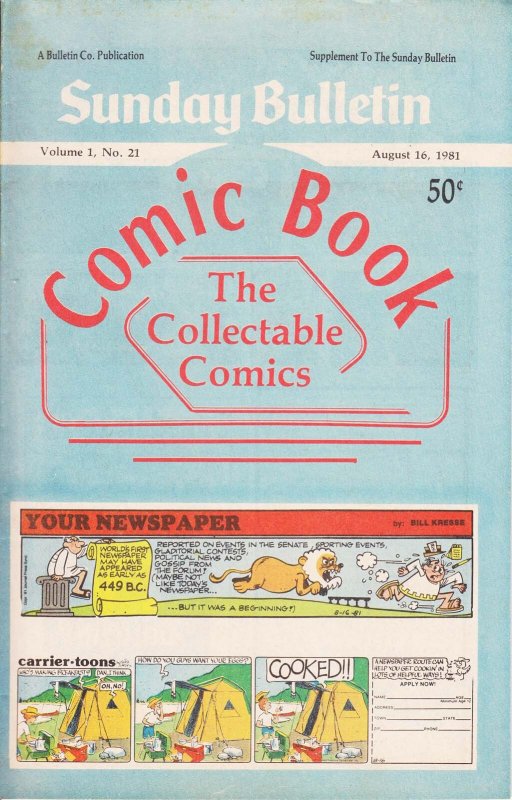Item: Sunday Bulletin Collectable Comics #21 | Publisher: Bulletin Co | Cover Date: August 1981 | Appearances: Shoe, Peanuts, Doonesbury, Superman, Andy Capp, Wizard of Id, Star Trek, Star Wars, Ripley's Believe it or Not, Spider-Man, Beetle Bailey, Garfield, Nancy, Herman, Tarzan, Prince Valiant, Dennis the Menace, Annie, Hagar the Horrible, Phantom, Blondie | With Economy shipping, each additional comic ships for just 50 cents more to customers in the USA. This listing contains a stock photo and information from ComicBase™ and © Human Computing. The stock photo is for reference only. If you would like to see a photo of the actual item, please message us prior to purchasing.Seller Information