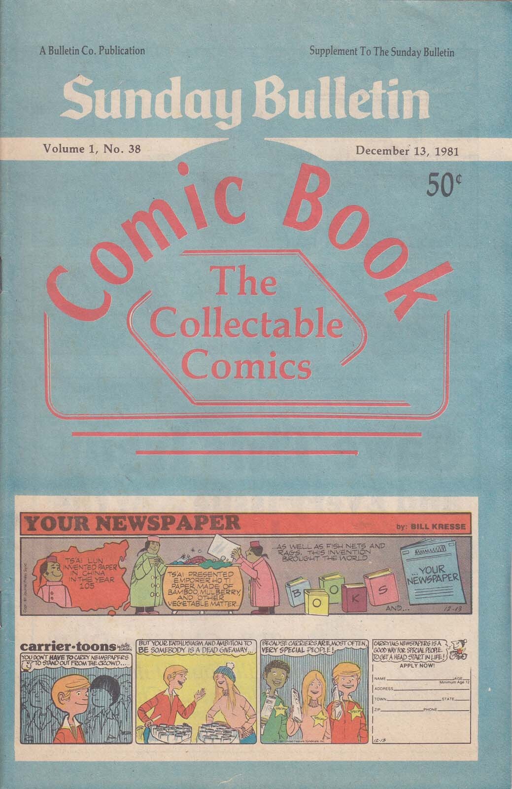 Item: Sunday Bulletin Collectable Comics #38 | Publisher: Bulletin Co | Cover Date: December 1981 | Appearances: Shoe, Peanuts, Doonesbury, Superman, Andy Capp, Wizard of Id, Star Trek, Star Wars, Ripley's Believe it or Not, Spider-Man, Beetle Bailey, Garfield, Nancy, Herman, Tarzan, Prince Valiant, Dennis the Menace, Annie, Hagar the Horrible, Phantom, Blondie, Muppets | With Economy shipping, each additional comic ships for just 50 cents more to customers in the USA. This listing contains a stock photo and information from ComicBase™ and © Human Computing. The stock photo is for reference only. If you would like to see a photo of the actual item, please message us prior to purchasing.Seller Information