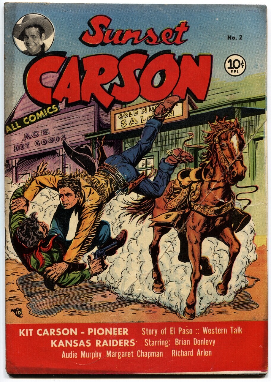 Grade: VG Sunset Carson #2 1951 Kit Carson El Paso Golden Age Western Kit Carson. El Paso. Kansas Raiders with Audie Murphy and Brian Donlevy. Rare issue. Tear mid opening side of cover. Grade: VG SKU: DHV-01-068