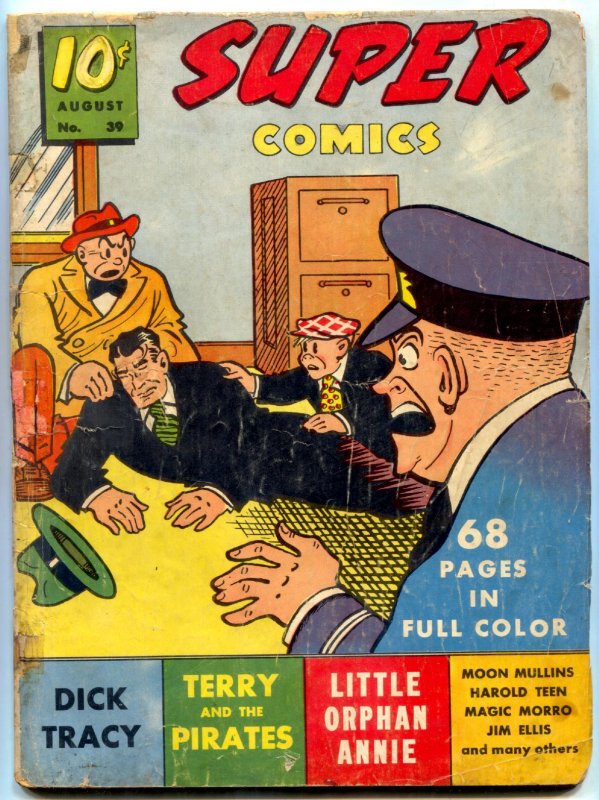 Grade: FR/GSuper Comics #39 1941- Dick Tracy- Smokey Stover- Magic Morro F/G with glue Dick Tracy cover. Magic Morro, Gumps, Smokey Stover, Little Orphan Annie and more. Tape on spine. Piece missing from back cover, cover glued to spine. Grade: FR/G SKU: DO-07-298