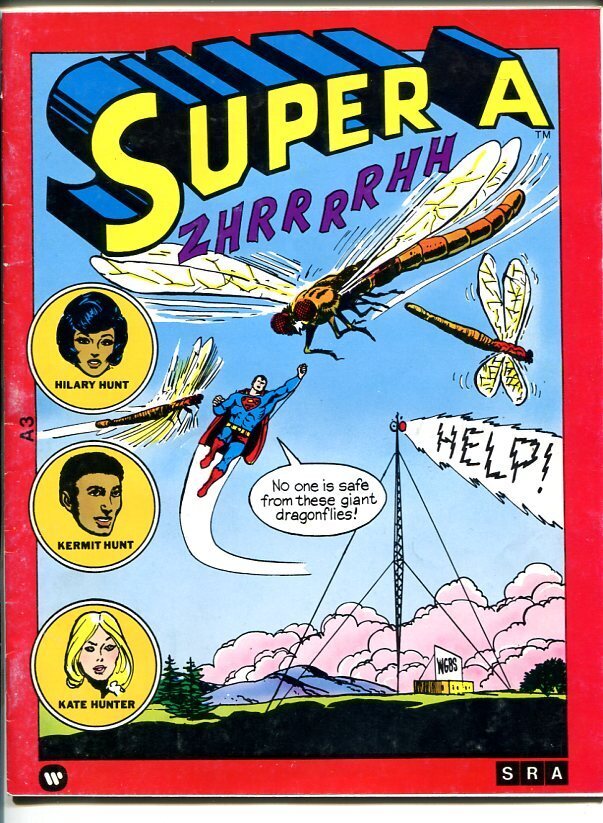Grade: VGSuper a -#3-1977-dc comics characters-superman cover-wonder woman-vg super a was a comic book series featuring dc characters that was used to teach children to read. These are illustrated with dc super heroes superman fighting giant dragonflies on cover unusual dc comics item superman, scooter, wonder woman, debbi joe kubert art this is a stock scan and might not depict the exact copy you will receive grade: vg sku: u2-56-126
