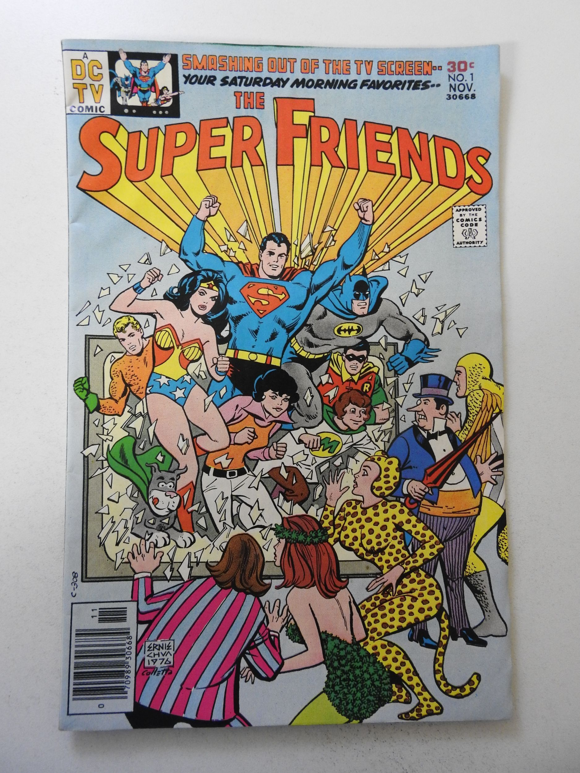 Super Friends #1 (1976) VG Condition moisture stain, rust on staples